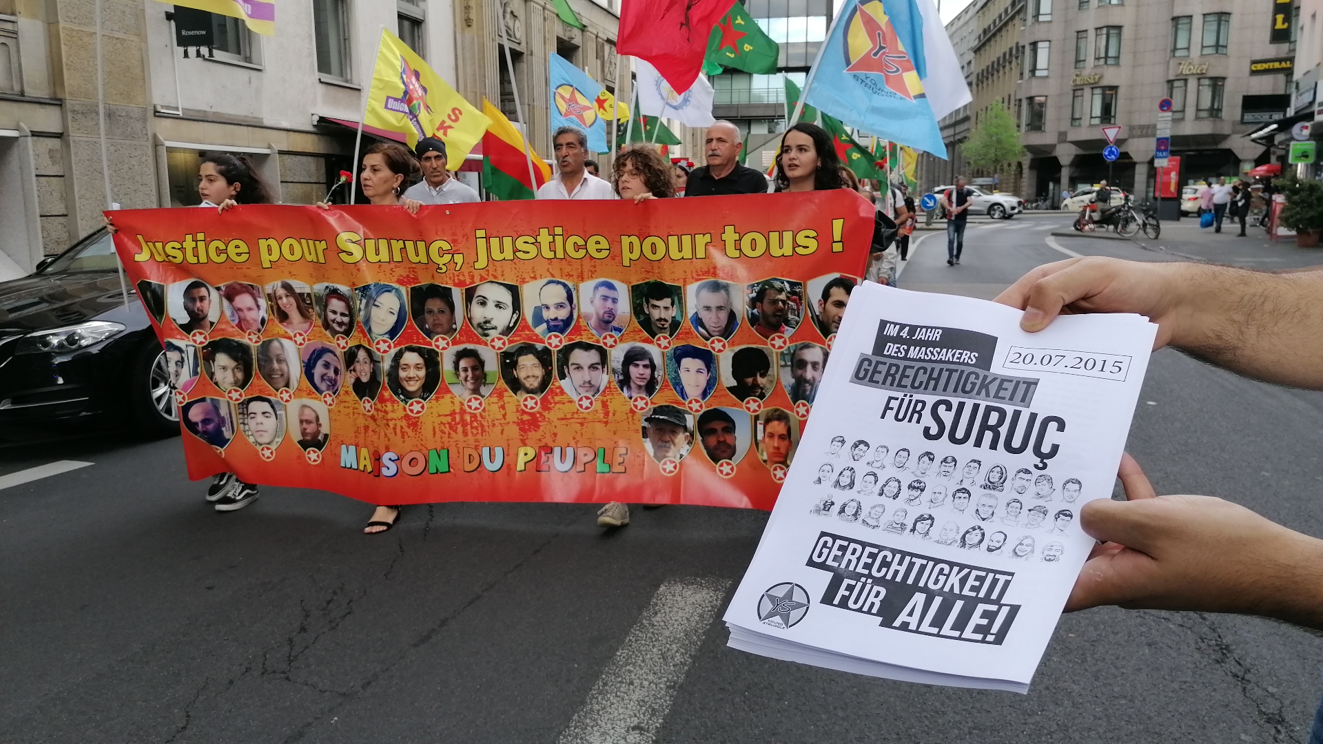 KÖLN – Almanya’nın Köln şehrinde Avrupa Ezilen Göçmenler Konfederasyonu (AvEG-Kon) ve Federasyona Medya (FED-MED) öncülüğünde kalabalık bir kitle Pirsûs Katliamı’nı protesto etti. Tam 4 yıl önce Kobanê’nin yeniden inşasında yer almak isteyen çok sayıda genç halkların kardeşliğine olan inançlarıyla yola çıkmış ve Pirsûs’ta buluşmuştu. 20 Temmuz 2015’te Amara Kültür Merkezi’nde çıktıkları yola dair basın açıklaması yapmak isteyen gençlere DAİŞ tarafından vahşi bir saldırı gerçekleştirilmişti. Sömürgeci Türk devletinin DAİŞ çetelerince yapılan bombalı saldırı sonucu 33 genç şehit düşmüş, 100’ü aşkın kişi yaralanmıştı.