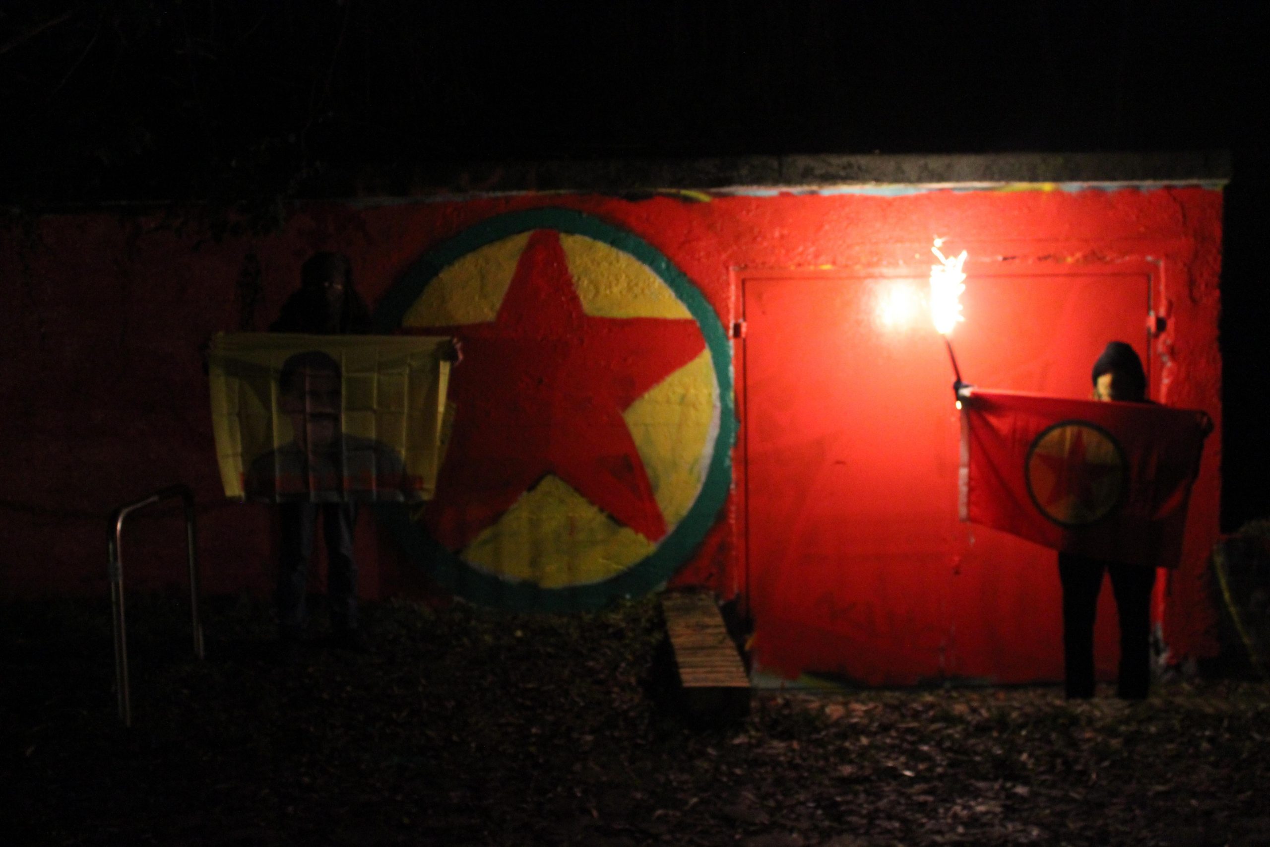 Leipzig'de Kürt ve enternasyonalist gençler, duvara PKK bayrağını boyadı. Gençler Alman devletinin PKK'ye yönelik yasakçı politikalarını protesto etti.