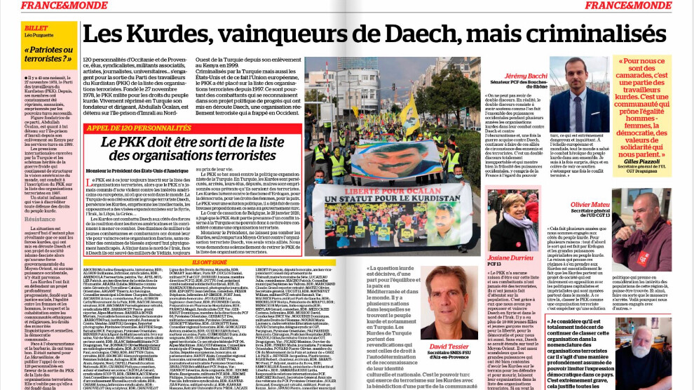 HABER MERKEZİ – Fransız La Marseillaise gazetesi, PKK’nin 43. kuruluş yıl dönümü vesilesiyle, PKK’nin terör örgütleri listesinden çıkartılması için Fransızlardan oluşan komitenin yürüttüğü çalışma sonucunda 120 şahsiyetin imzaladığı bir çağrı metnini yayımladı. Çağrıcılar arasında vekiller, sendikacılar, gazeteciler, entelektüeller ve aktivistler de yer alıyor. Çağrı ABD Başkanı’na hitaben yazıldı.