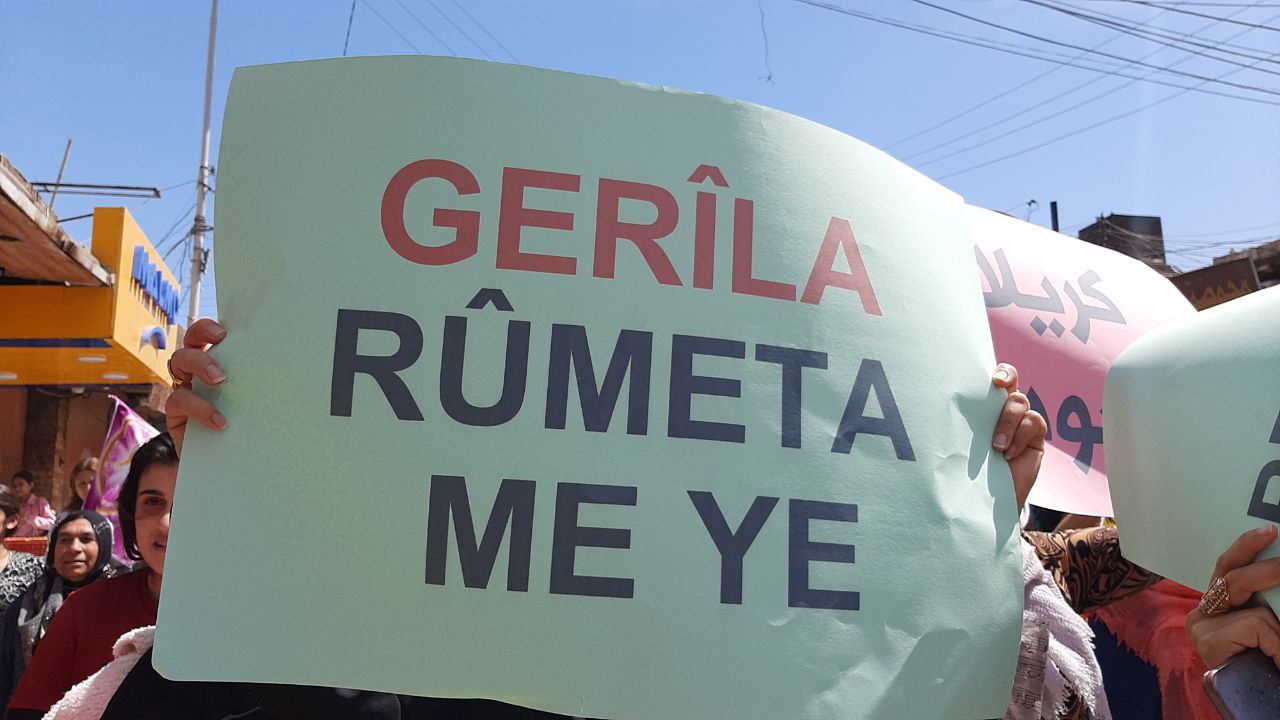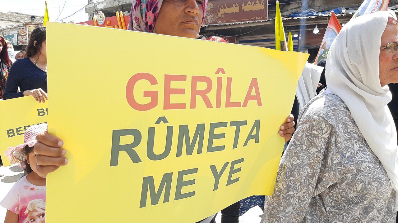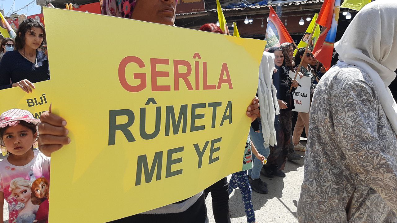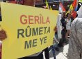 Önder APO’nun filemalarının kaldırıldığı yürüyüşte, “Gerîla Rumata me ye” ” Bijî Berxwedana Gerîla” yazılı pankartları açıldı. Ayrıca halk tarafından sık sık Bijî Berxwedana Metîna sloganları atılıyor.