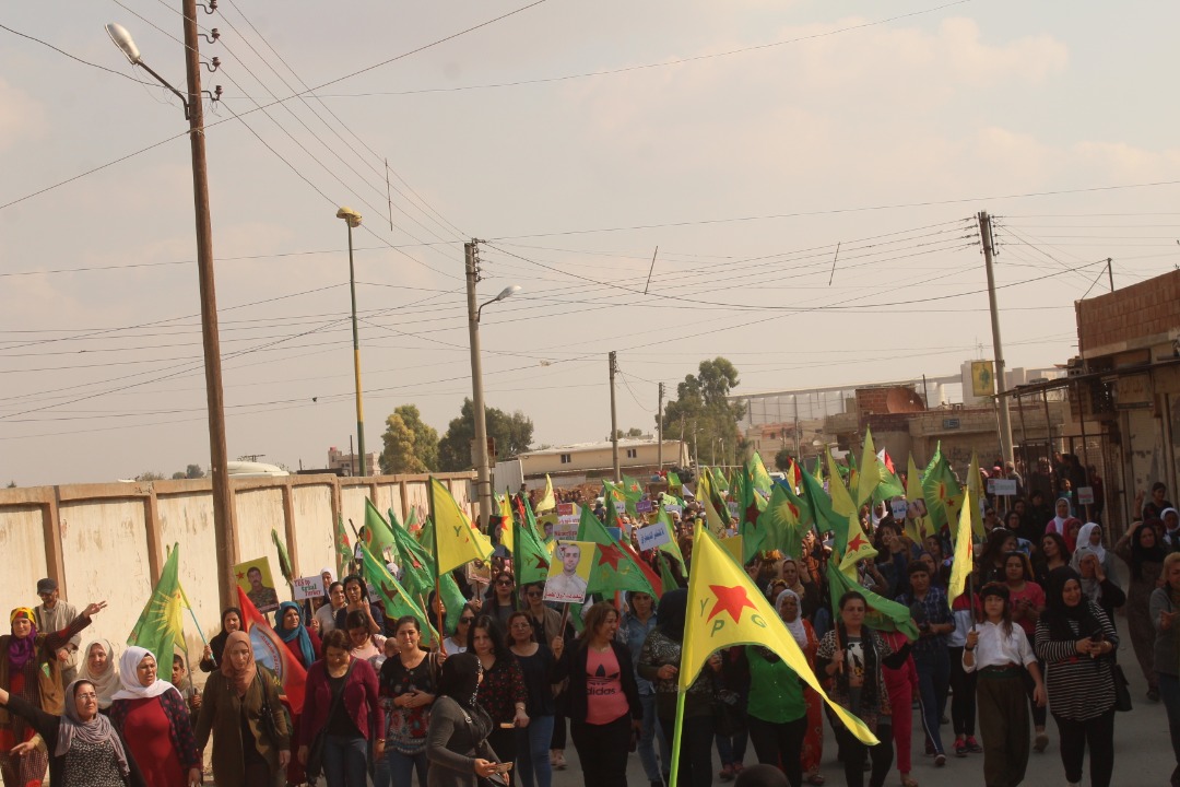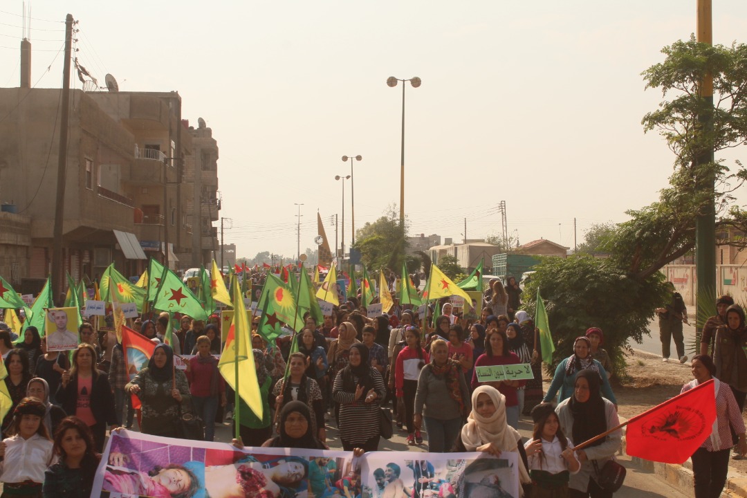 Yürüyüş esnasında, YPG, YPJ, QSD bayrakları, fosfor gazı ile şehit düşenlerin fotoğrafları ve birçok pankart taşınırken, ‘Türk işgaline hayır’, ‘Katliamcı Erdoğan’ ve yaşasın QSD direnişi sloganları kitlesel bir şekilde atıldı.