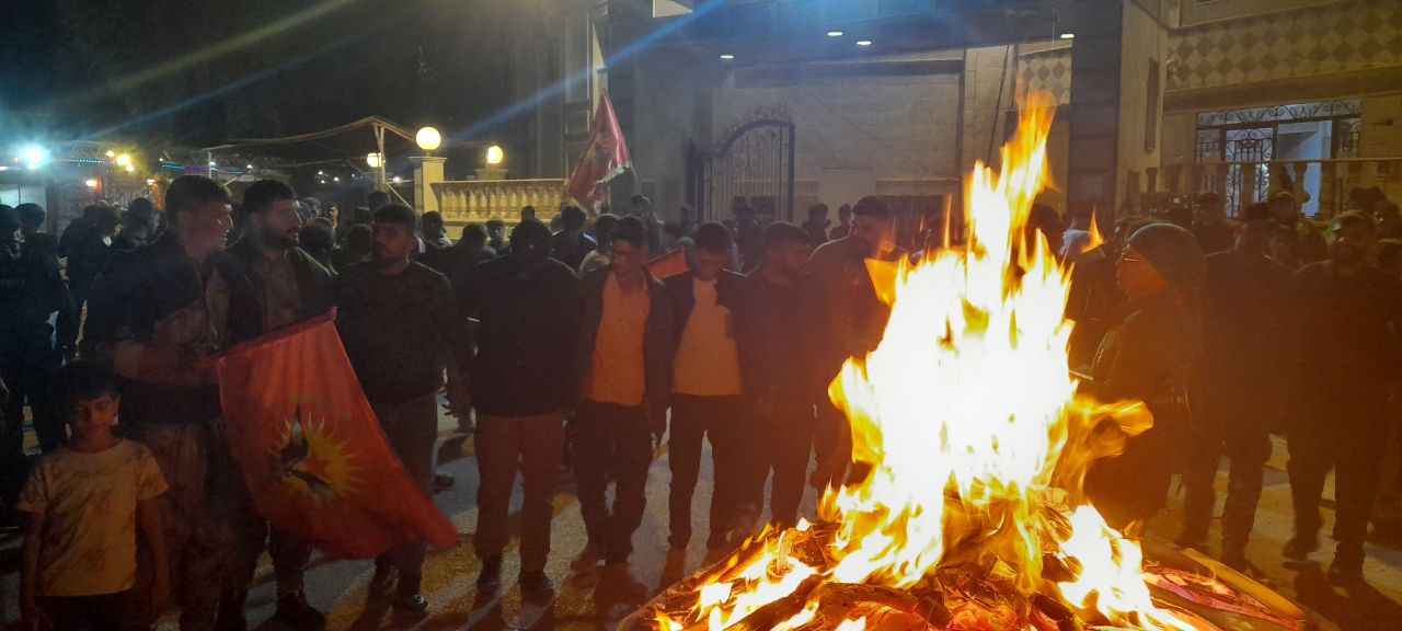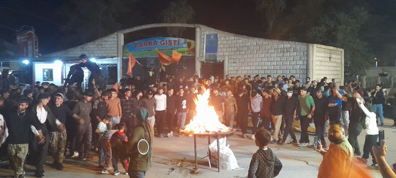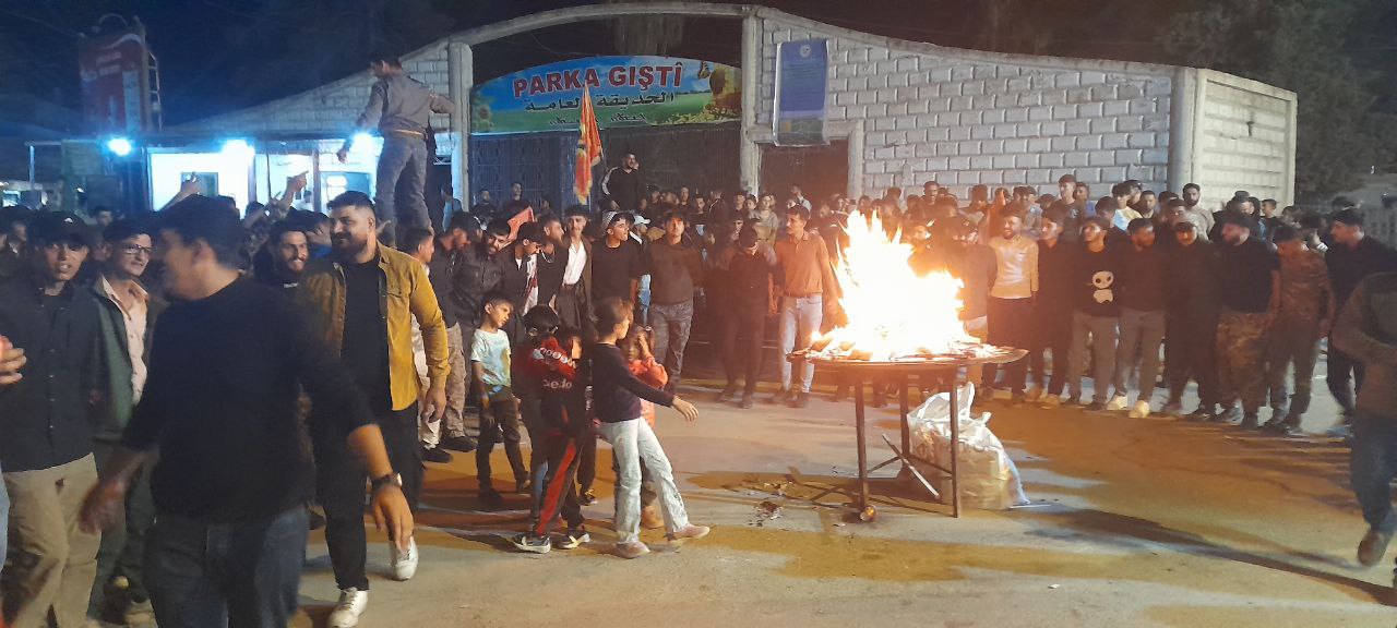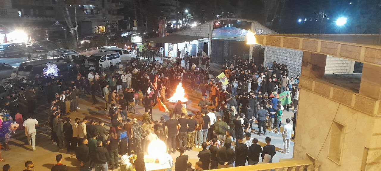 QAMIŞLO- Qamişlo’nun Medine Şebab (gençlik merkezi) Merkezi önünde gençler, akşam saatlerinde Newroz Ateşi yakarak hem Suriye Geçiş Hükümetinin Newroz kutlamalarının yasaklanmasına karşı tepkilerini gösterdi hem de QSD’nin kuruluş yıldönümünü kutladı.