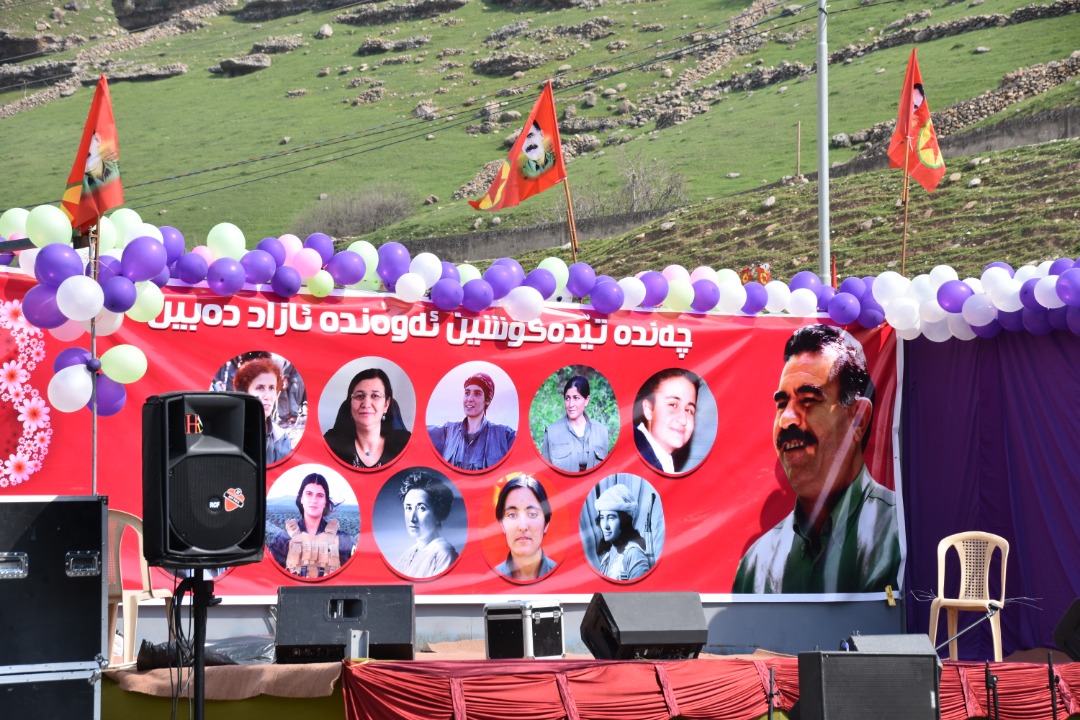 Kutlama alanında PKK, PJAK, KCK, RJAK ve Tevgera Azadi bayrakları dalgalanırken, “Em çiqas têbikoşin, ewqase azad dibin/ Ne kadar mücadele edersek, o kadar özgürleşiriz” yazılı pankartın asıldı. Sahne ise PKK Lideri Abdullah Öcalan ve direnişin öncü isimleri Sakine Cansız, Roza Lüksemburg, Viyan Soran, Leyla Qasim, Leyla Xalid’in fotoğraflarıyla donatıldı.