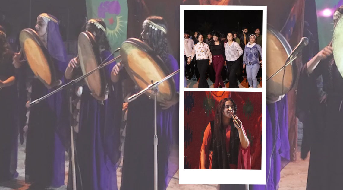 Müzik eşliğinde halay çekerek coşkulu anlar yaşadı. Genç Kadınlar, sık sık “Jin jiyan azadî” sloganları attı.