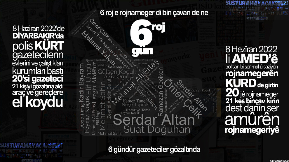 Rehin tutulan 20’si gazeteci 22 kişinin isimleri şöyle: “Dicle Fırat Gazeteciler Derneği (DFG) Eşbaşkanı Serdar Altan, Xwebûn Gazetesi Yazı İşleri Müdürü Mehmet Ali Ertaş, JİNNEWS Müdürü Safiye Alagaş, JINNEWS editörü Gülşen Koçuk, Mezopotamya Ajansı (MA) editörü Aziz Oruç, gazeteciler Ömer Çelik, Suat Doğuhan, Ramazan Geciken, Esmer Tunç, Neşe Toprak, Zeynel Abidin Bulut, Mazlum Doğan Güler, Mehmet Şahin, Elif Üngür, İbrahim Koyuncu, Remziye Temel, Mehmet Yalçın, Abdurrahman Öncü, Lezgin Akdeniz, Kadir Bayram ve Feynaz Koçuk ile İhsan Ergülen. “