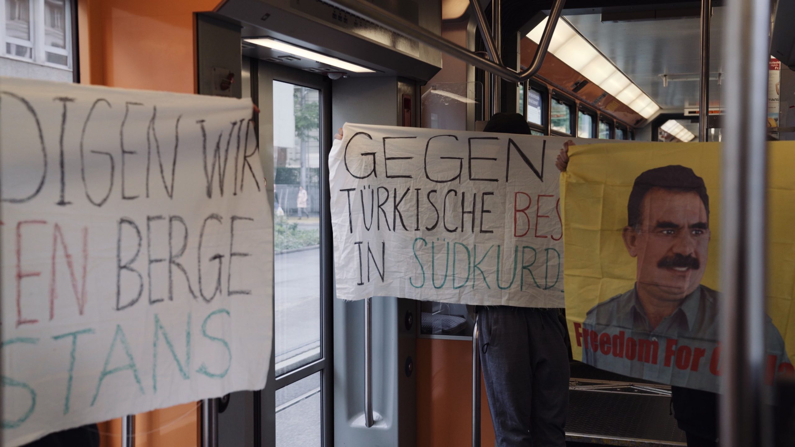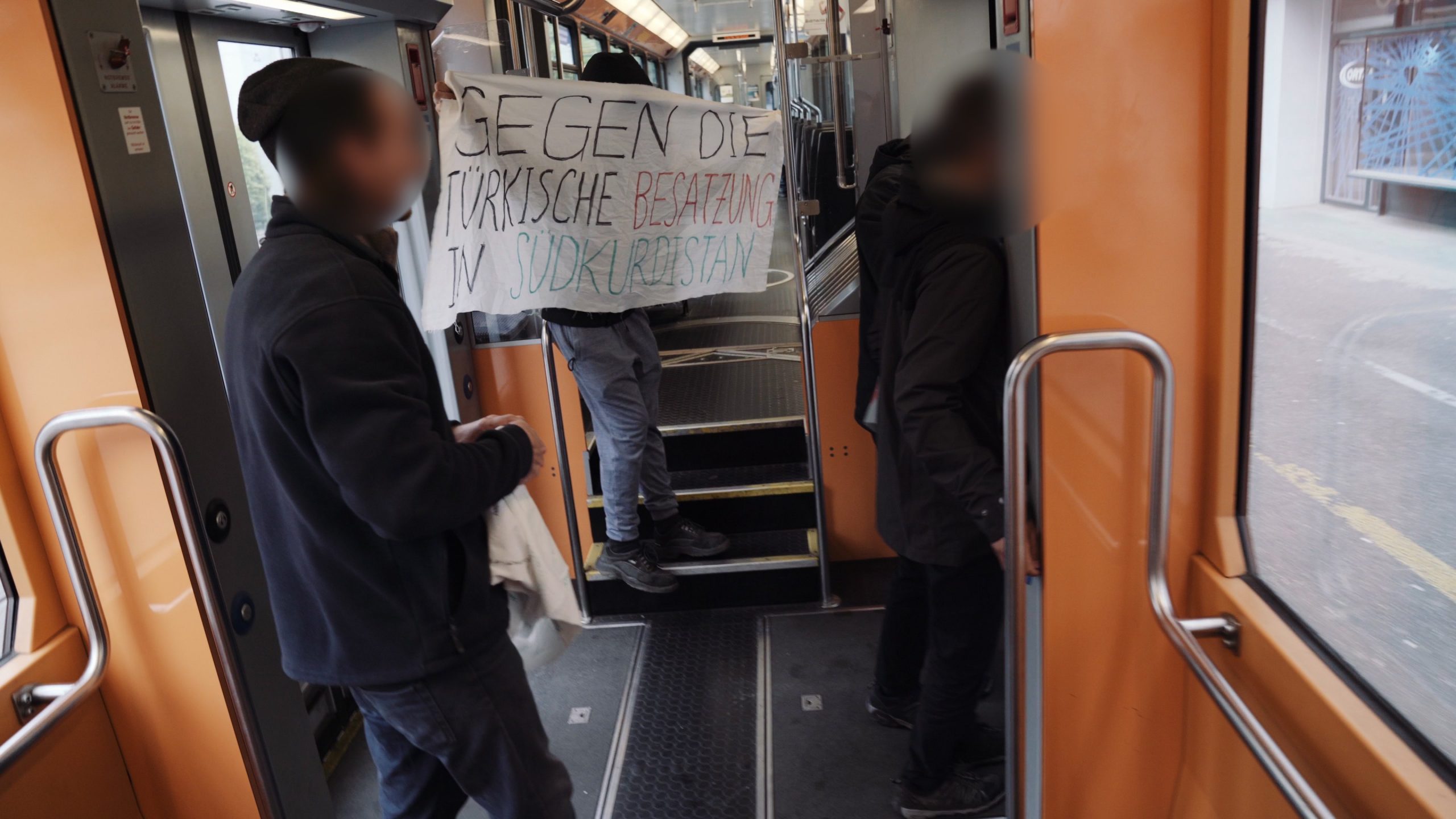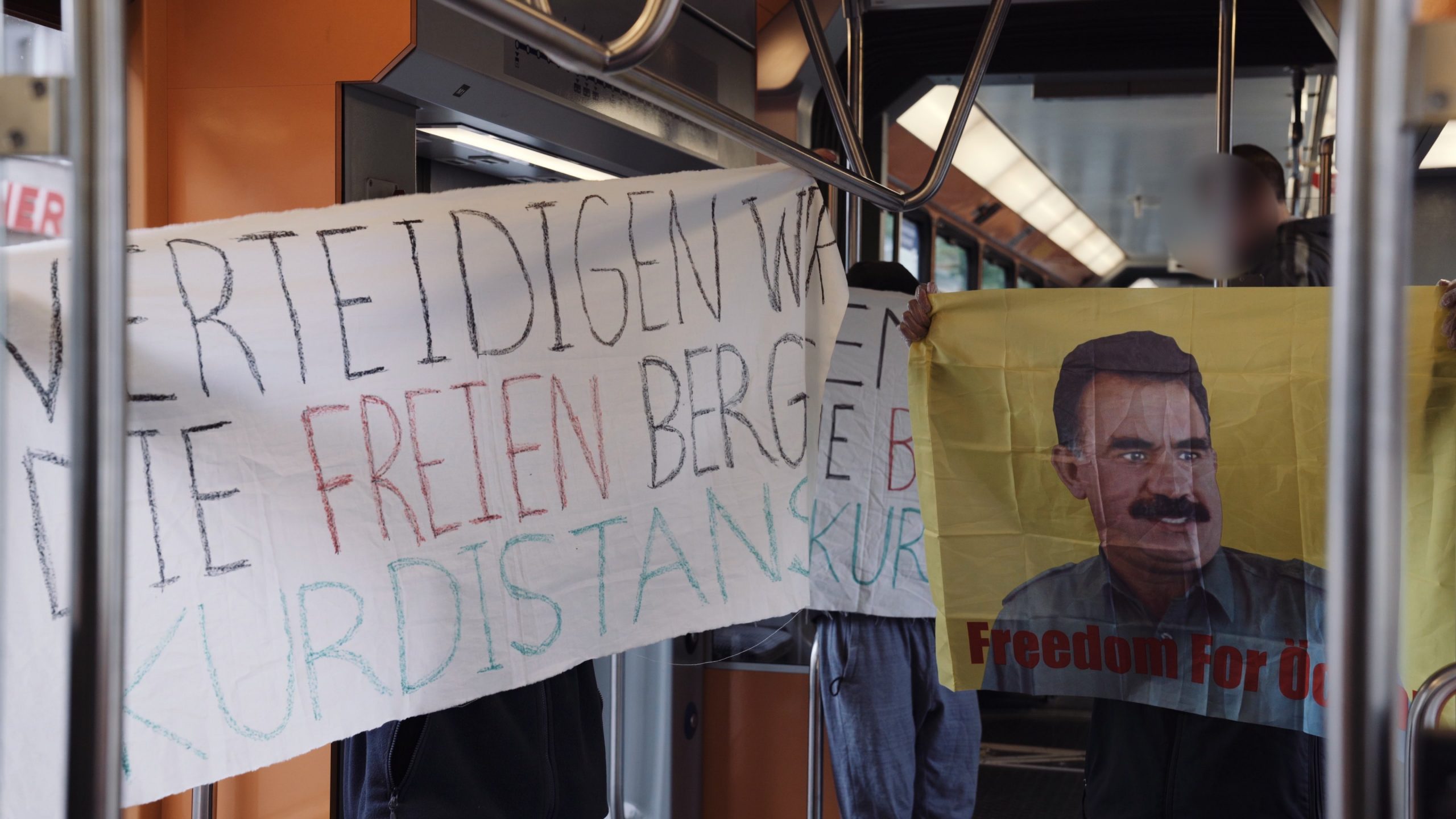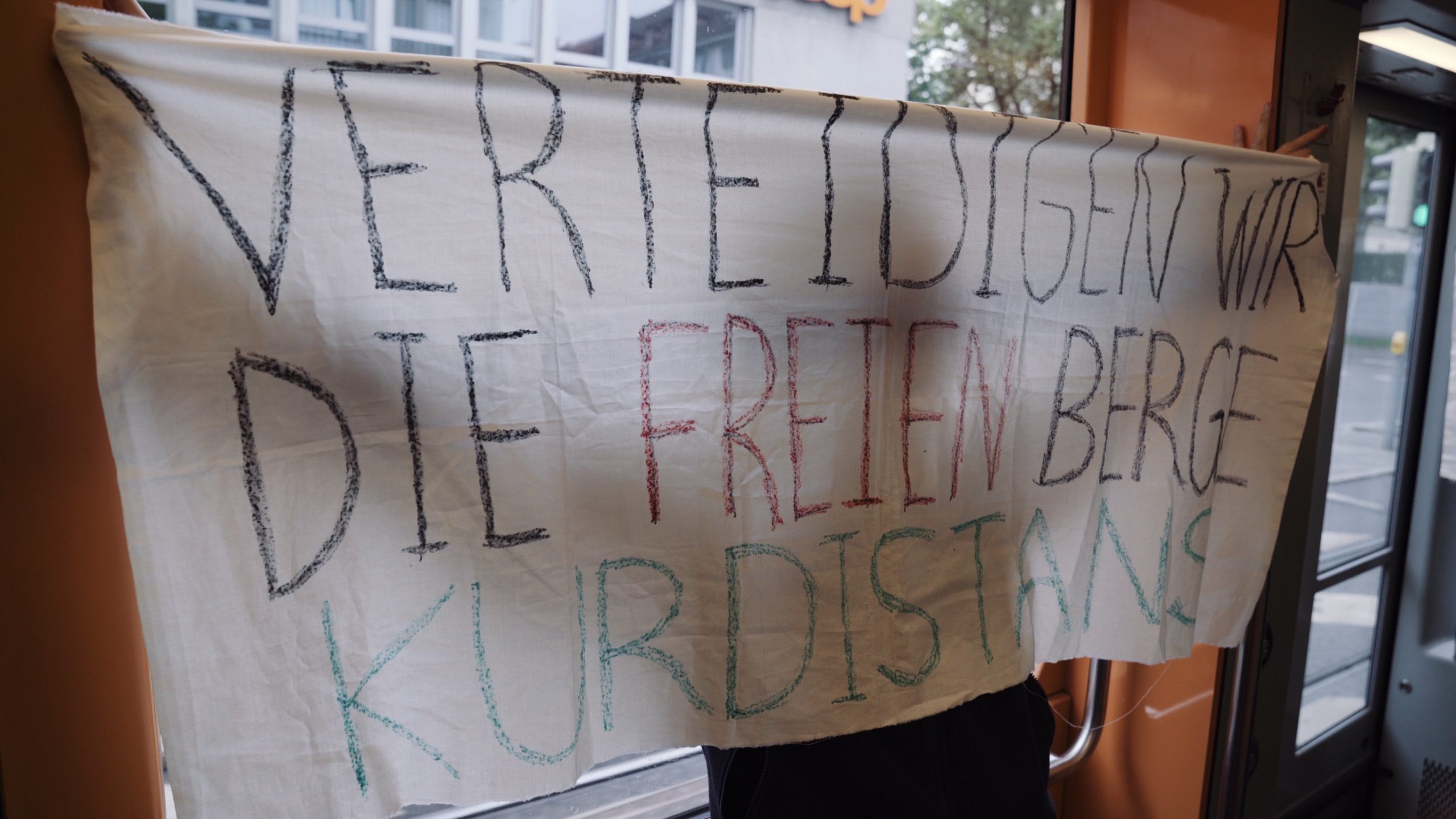 Şehir içinde hareket eden tramvaylarda üzerinde Almanca, ”Kürdistan’ın özgür dağlarını savunalım” ve “Güney Kürdistan’daki Türk işgaline karşı duralım” yazılı pankartlar ile Halklar Önderi Abdullah Öcalan’ın posterini açan gençler, hazırladıkları Almanca bildiriyi de yolculara dağıttı.