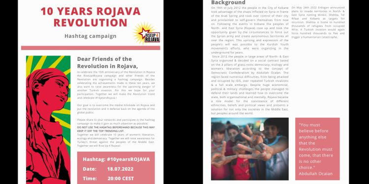 HABER MERKEZİ – Rojava’da Devrim’inin 10. yıl dönümünü kutlamak için RiseUp4Rojava ve diğer devrim dostları hashtag kampanyası düzenliyor. Bu on yılda elde edilen başarıları kutlamanın yanı sıra, yaklaşan Türk işgali tehlikesine karşı farkındalık yaratılmak isteniyor.