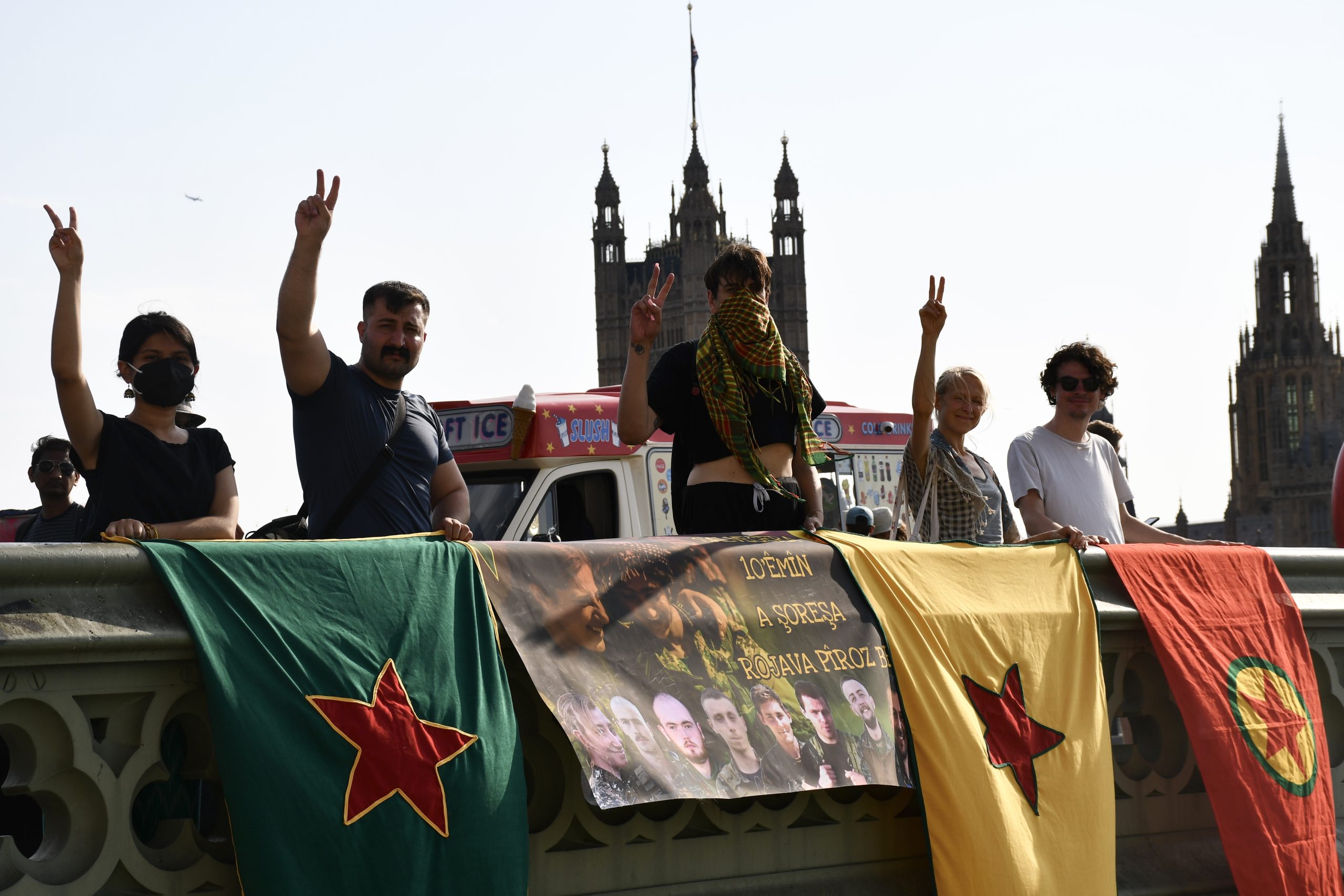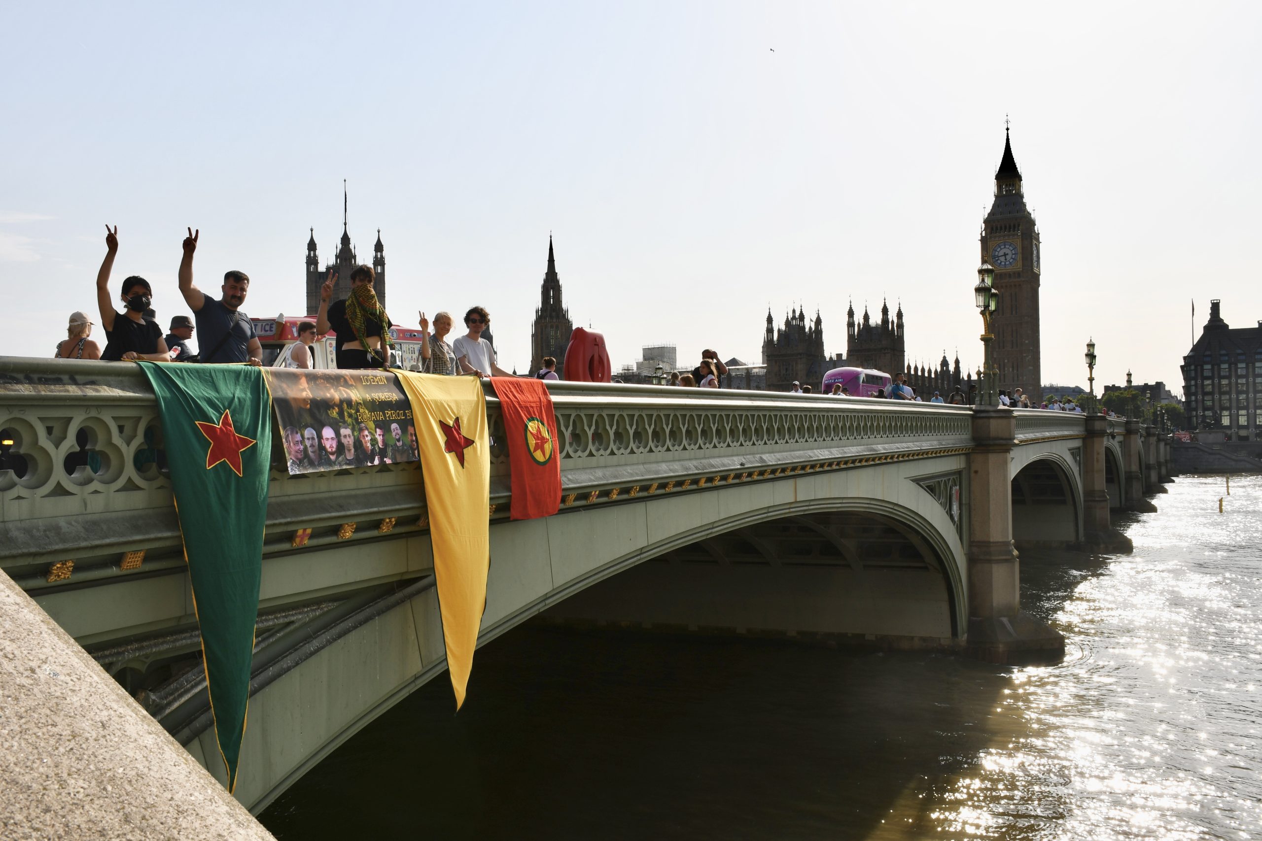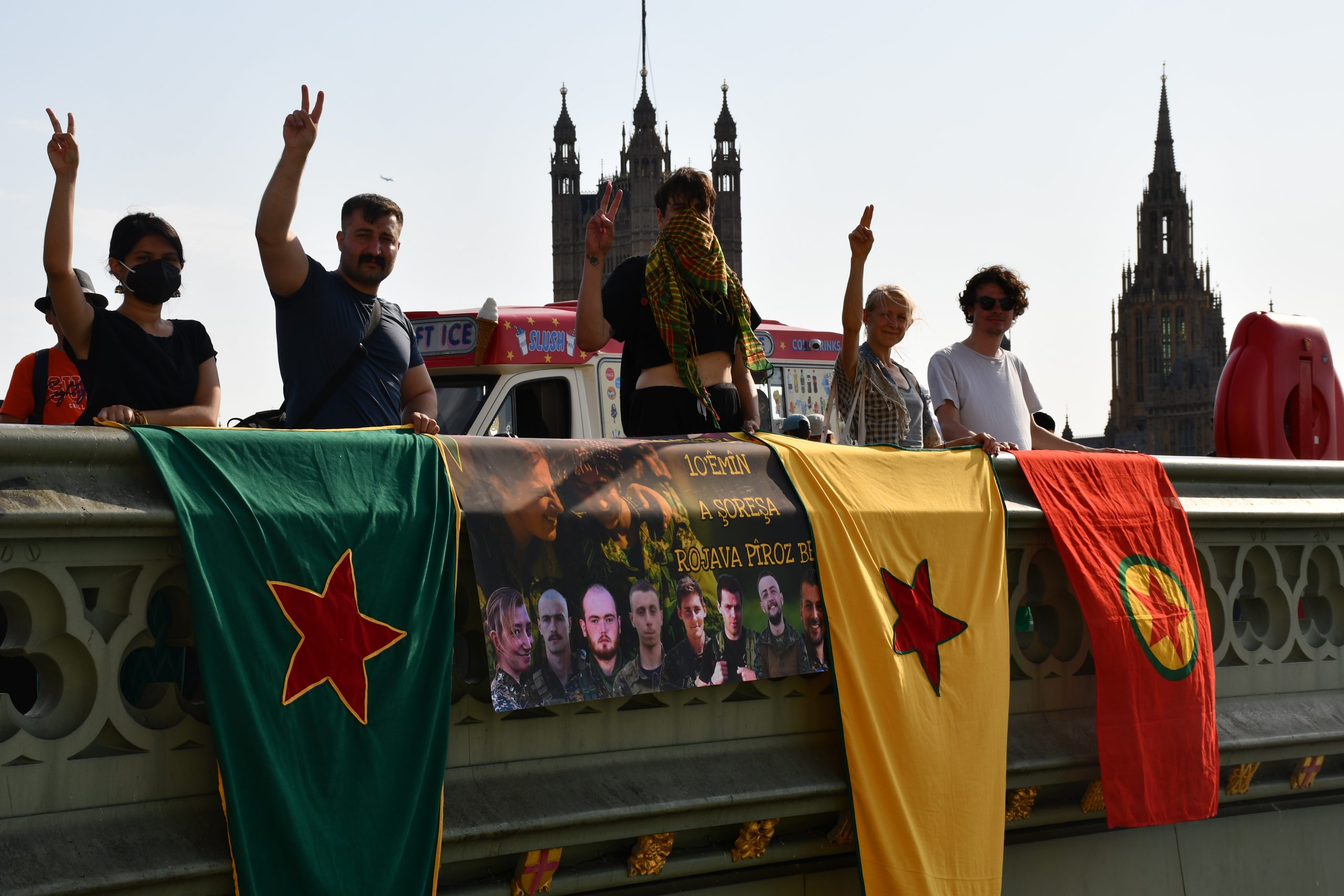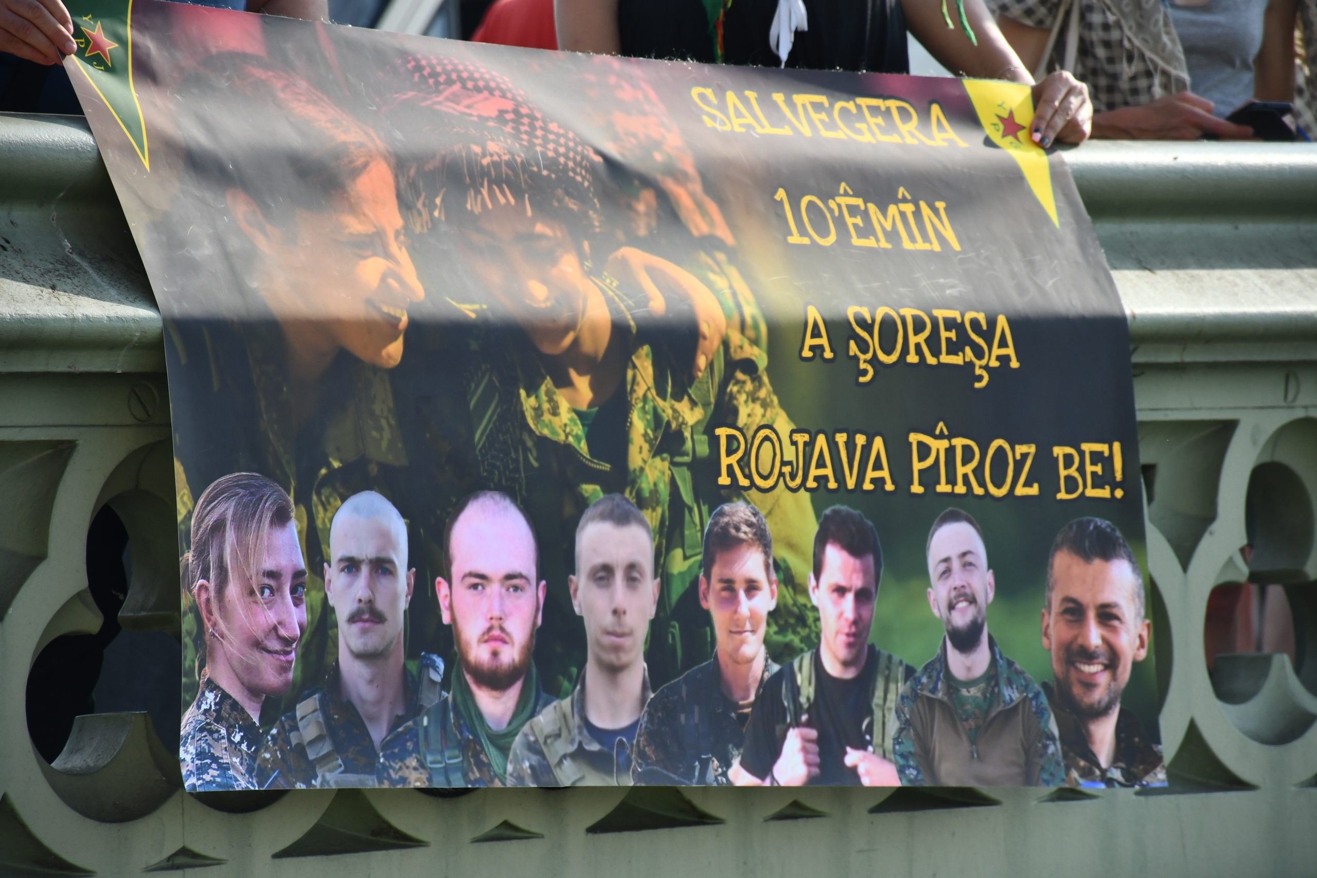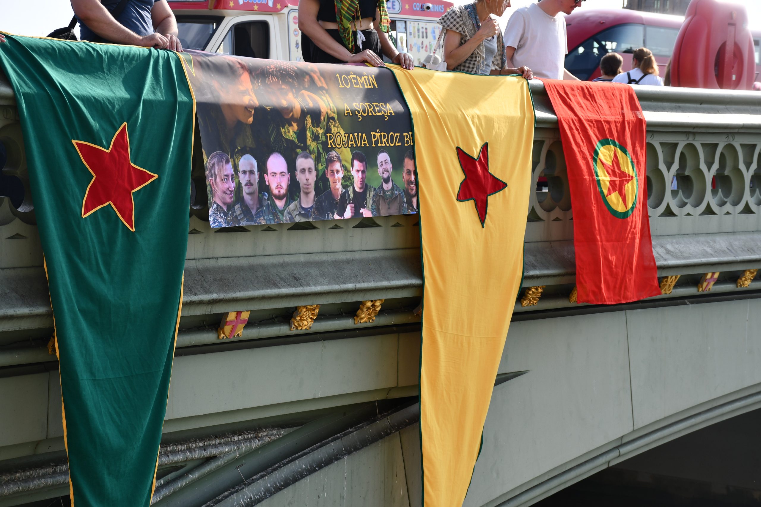 LONDRA – Rojava Devrimi’nin 10’uncu yıl kutlamaları Avrupa ülkelerinde büyük bir coşku ile kutlanmaya devam ediyor. Londra’da TCŞ (Tevgera Ciwanên Şoreşger), JXK (Jinên Xwendekarên Kurdistan) ve London Kurdistan Solidarity enternasyonalist aktivistleri şehir merkezinde Westminster Köprüsünde Britanya’dan mücadele saflarına katılan 8 devrim şehidi Ş. Hêlîn Qereçox, Ş. Soro Zinar, Ş. Canşêr Zagros, Ş. Berxwedan Givara, Ş. Givara Rojava, Ş. Kemal, Ş. Şoreş Amanos ve Ş. Fîraz Dağ şahsında Rojava Devriminin 10. yılını selamlayan pankart eylemi gerçekleştirdi.