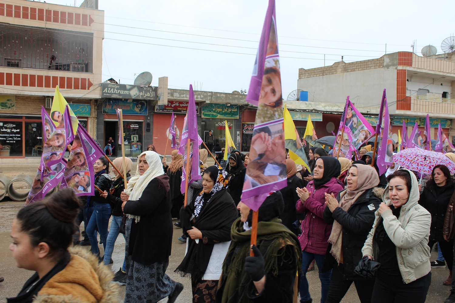 Aynı amaçla Qamişlo’da da halk alanlara çıktı. Kent merkezindeki Depolar Kavşağı’nda bir araya gelen kitle, ellerinde üç kadın devrimcinin posterleriyle yürüyüşe geçti.