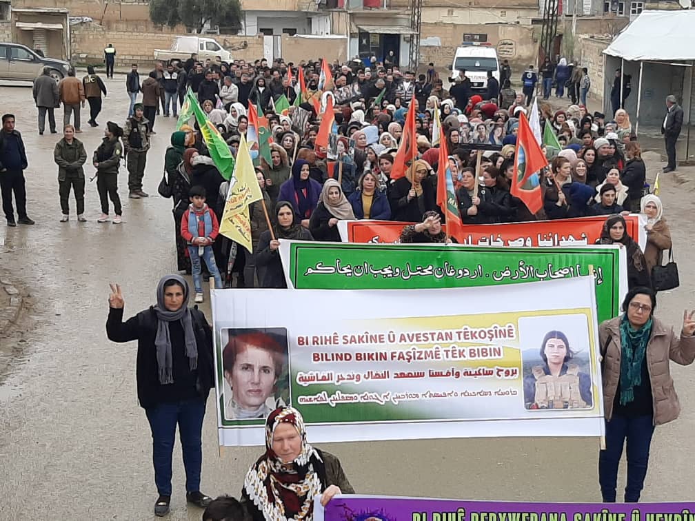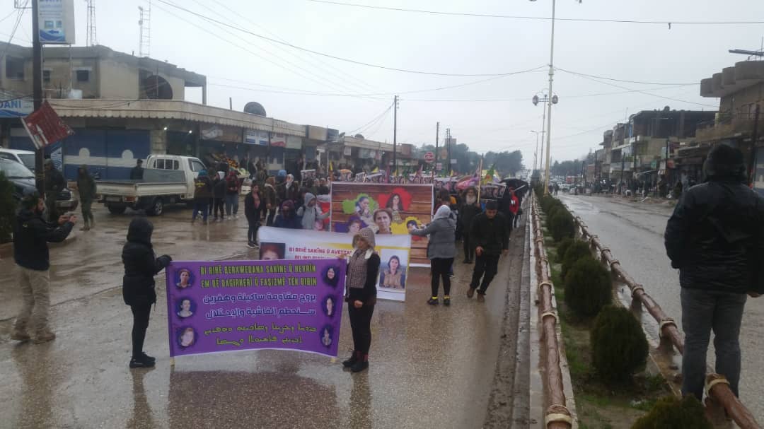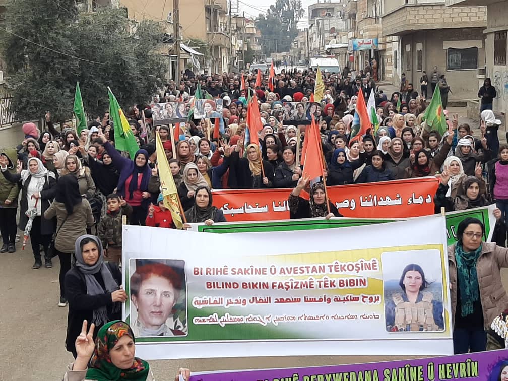 Hesekê’de de aynı amaçla düzenlenen yürüyüşe yüzlerce kişi katıldı. Til Hecer ilçesi Sağlık Merkezi önünde başlayan yürüyüşte halk QSD, YPG, YPJ ve Kongreya Star bayrakları taşıdı, sloganlarla üç kadın devrimciyi andı.