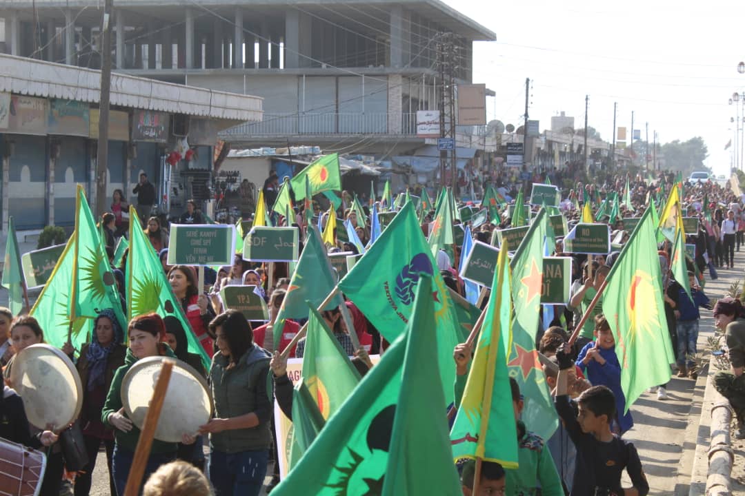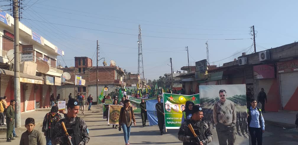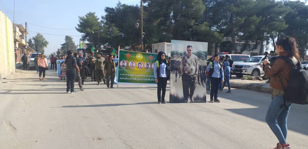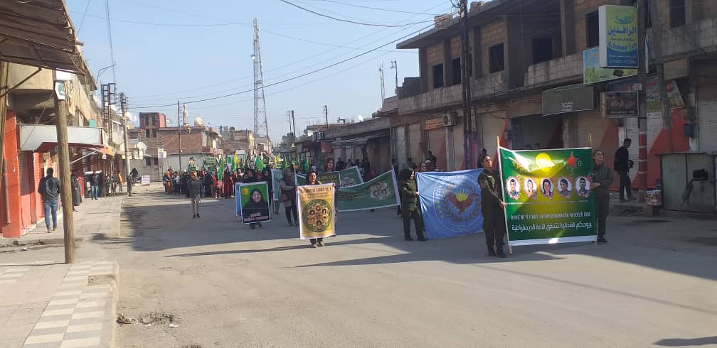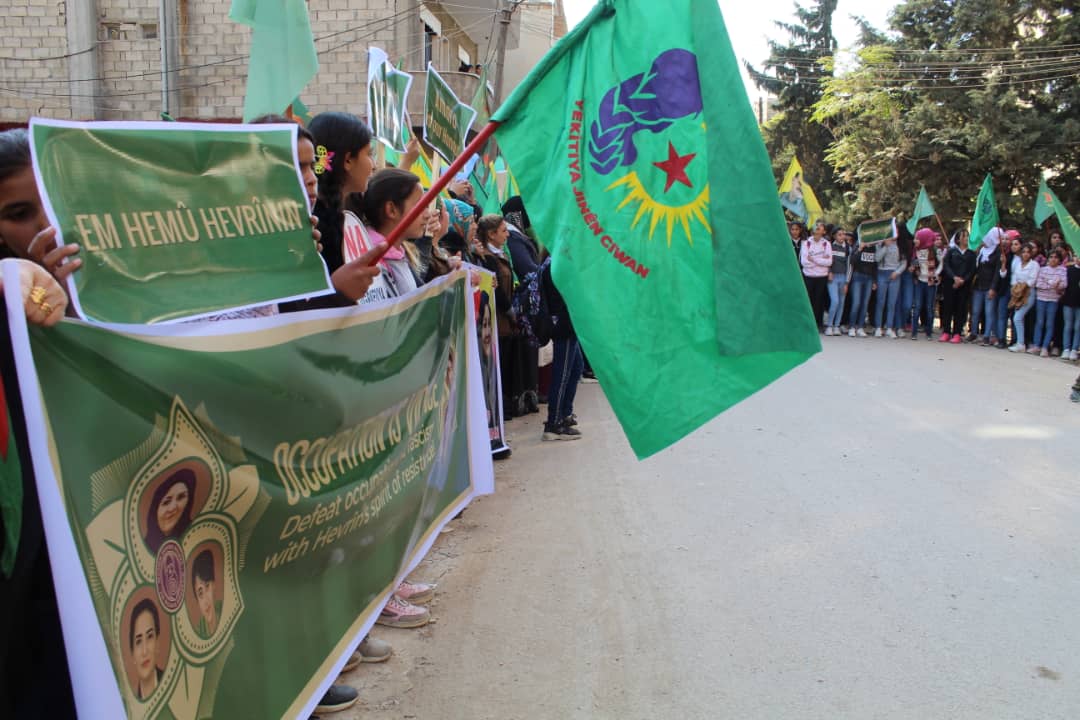 Yürüyüşte, üzerinde “Hevrin kadın birliğinin sembolüdür”, “Şiddet işgaldir! Hevrînlerin direnişiyle işgal ve faşizmi yenelim”, “Zafer günü geldiği vakit arkana baktığında teslim olmadığın için kendinle gurur duyacaksın” yazılı pankartlar ile YPJ bayrakları, Hevrîn Xelef, Eqide Ana’nın posterleri taşındı. Yürüyüş ilçenin batısına kadar sloganlar eşliğinde devam etti.
