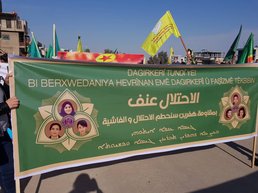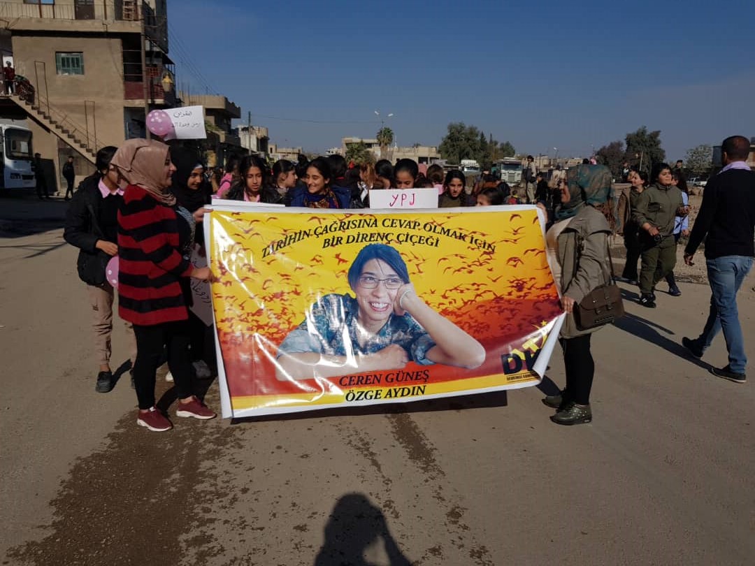 Kadına yönelik şiddet ve Türk devleti karşıtı sloganların atıldığı yürüyüşte Şehit Hevrîn, Amara Rênas ve çeteler tarafından esir alınan Çîçek Kobanê’nin posterleri taşındı.