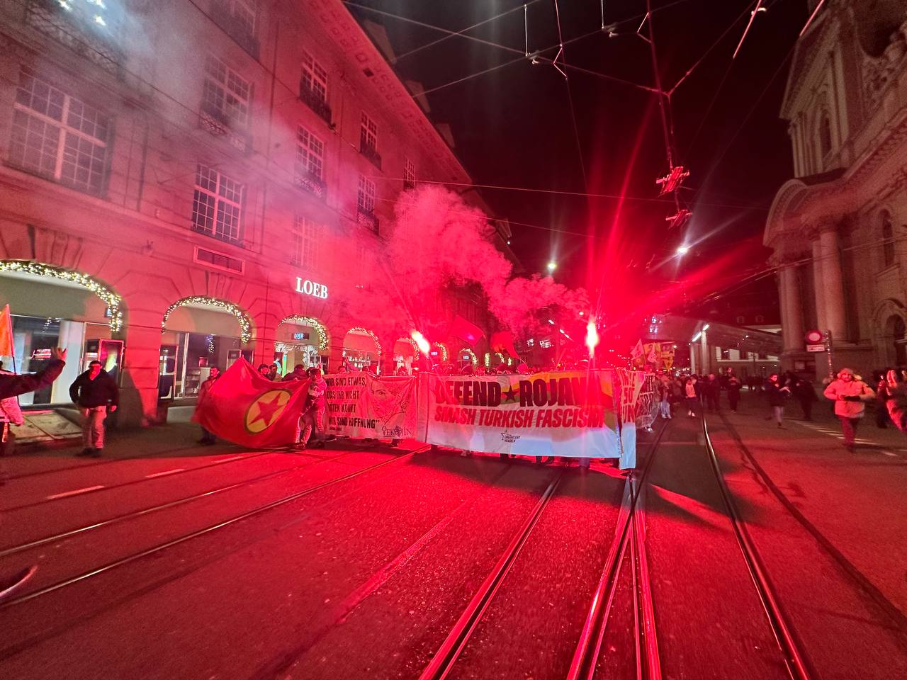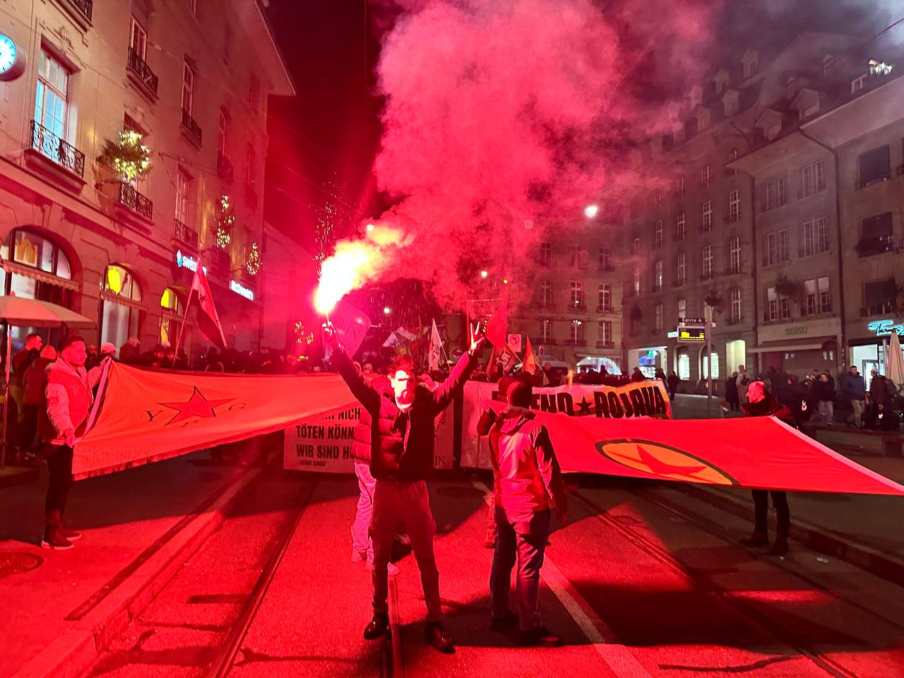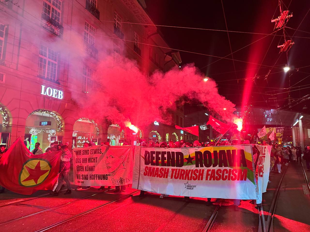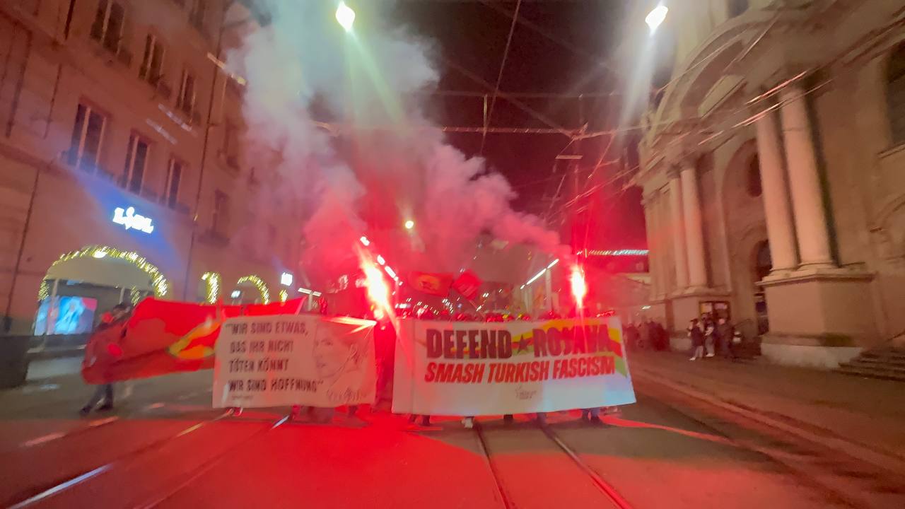 Bern şehir Merkezinin içerisinde sloganlar ve zılgıtlar eşliğinde yapılan bir saatlik yürüyüşte, Rojava Devrimini anlatmak ve yapılan saldırılara ilişkin bildiriler dağıtıldı.