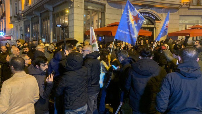 HABER MERKEZİ- İşgalci Türk devleti destekli HTŞ ve ÖSO cihatçı faşist çetelerinin Halep ve Rojava’ya yönelik saldırılarını Şişhane’de protesto etmek isteyen İstanbul Emek, Barış ve Demokrasi güçlerine polis saldırdı. DEM Parti milletvekillerinin aralarında bulunduğu çok sayıda kişi abluka altına alındı. Bu keyfi uygulamayı, ” Bijî berxwedana Rojava” sloganıyla protesto eden abluka dışındaki kitleye de saldıran Türk polisi 50 kişiyi işkenceyle gözaltına aldı.