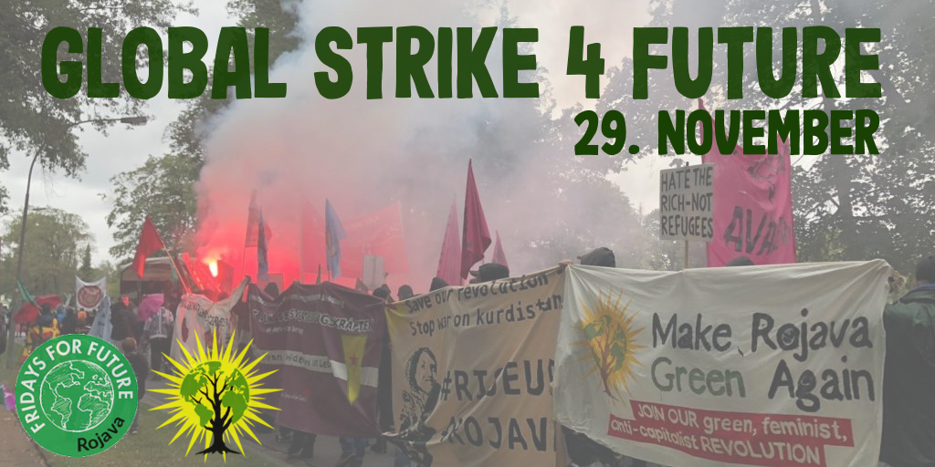 “29 Kasım’da küresel iklim adaleti hareketinin önümüzdeki küresel eylem günleri, Şili’den Rojava’ya, Hong Kong’dan Brezilya’ya kadar binlerce insanın dünya çapındaki protestolarıyla kutlanacak. Hepsi halkın ve doğanın faydası için savaşıyor, güç ve kâr standartlarına göre değil, kendi geleceğini belirlemeye yönelik ve onurlu bir yaşam talep ediyorlar. İklim krizi zamanın şartlarıyla karşı karşıya kalırken, politika ve firmalar kötü uzlaşmalarını büyük çözümler olarak sunmaya çalışıyorlar. Ve dünya güçleri Rojava’daki savaşta ara bulucu olarak kendilerini kutlarken, Türk NATO uçaklarının bombaları insanları bombalamaya ve doğayı harap etmeye devam ediyor. Hepimiz biliyoruz ki gerçek iklim adaleti ve küresel barış, ancak temelden sistemik değişim ile sağlanabilir.