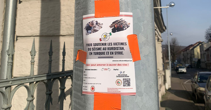 Faşist Türk devletinin depremzelere herhangi bir yardımda bulunmaması aksine gelen yardımları engellemesi üzerine acı bir bilançoya doğru sürüklenen depremi halkların dayanışmasıyla aşılacağını belirten gençler Heyva Sor a Kurdistan ve Roja Sor adına bugün başlayan ve devam edecek olan halkı dayanışmaya yönlendiren afiş ve yardım planı çalışması başladı. Kısa sürede ilgi gören TCŞ ve TekoJIN çalışması yerel Fransız basını tarafından ilgiyle karşılandı.