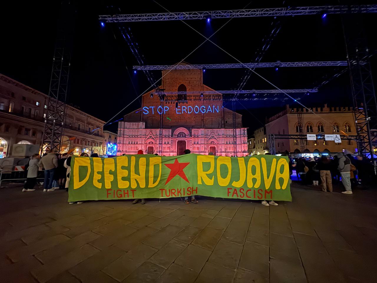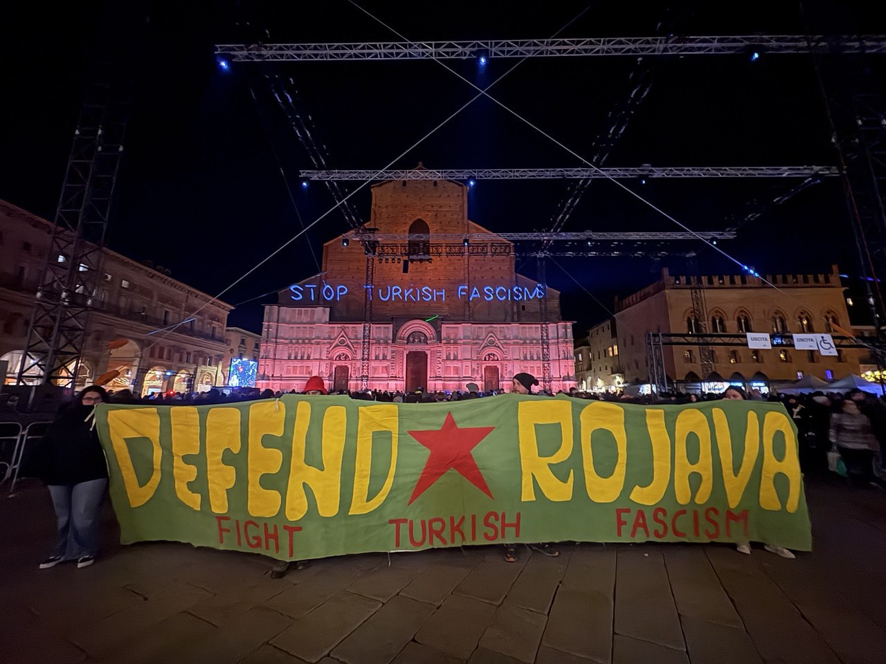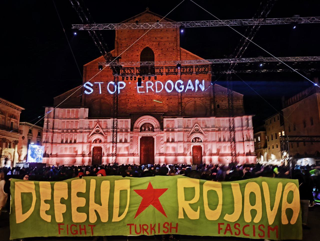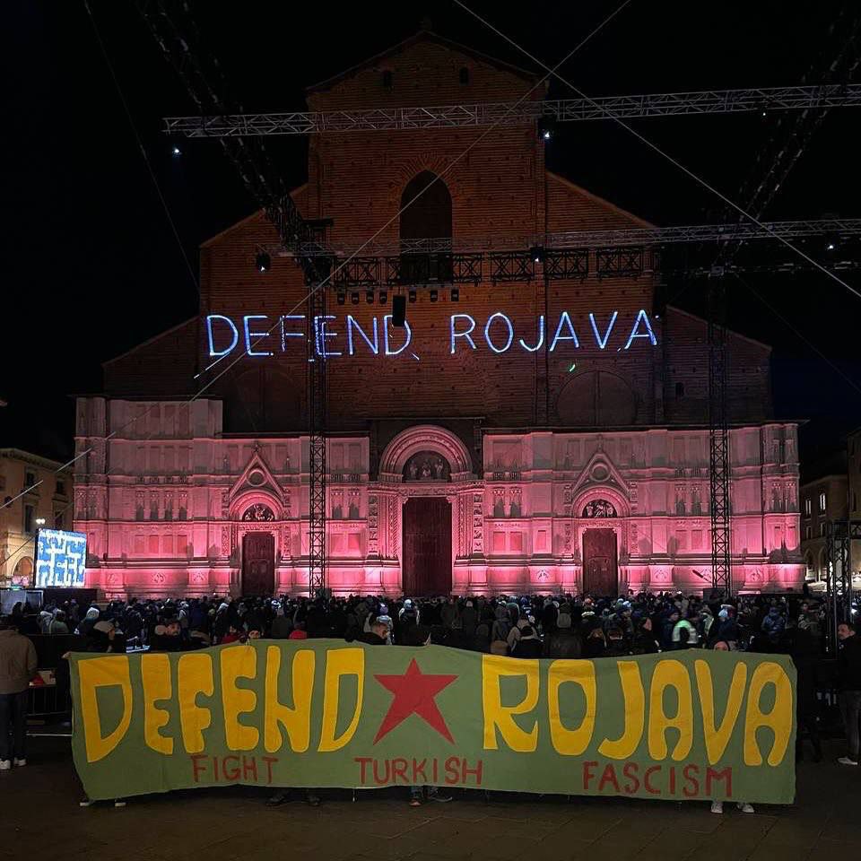 BOLOGNA – İtalya’nın Bologna kentinde enternasyonalist gençler, işgalci Türk devleti ve SMO çetelerinin Rojava dönük işgal saldırılarını, lazer yöntemi ile Saint Petronio kilise duvarına “Erdoğan’ı Durdur”, “Türk Faşizmini Durdur” ve “Nazım Daştan, Cihan Bilgin -Şehîd Namirin” yazıları yansıtıldı.