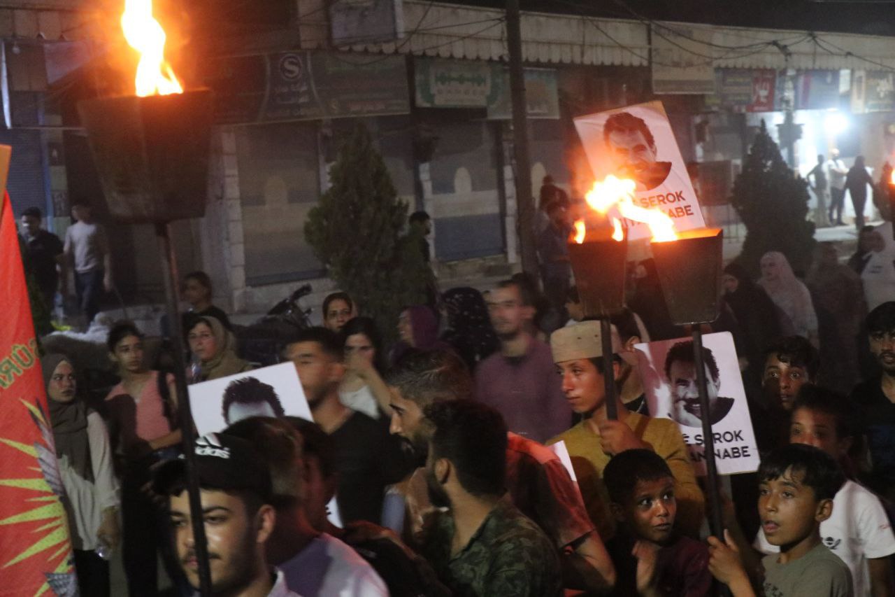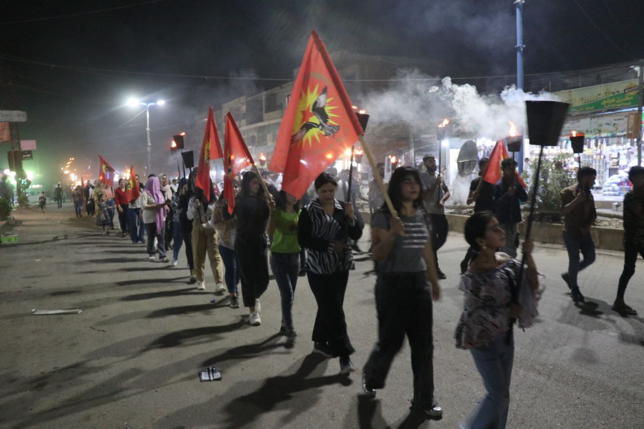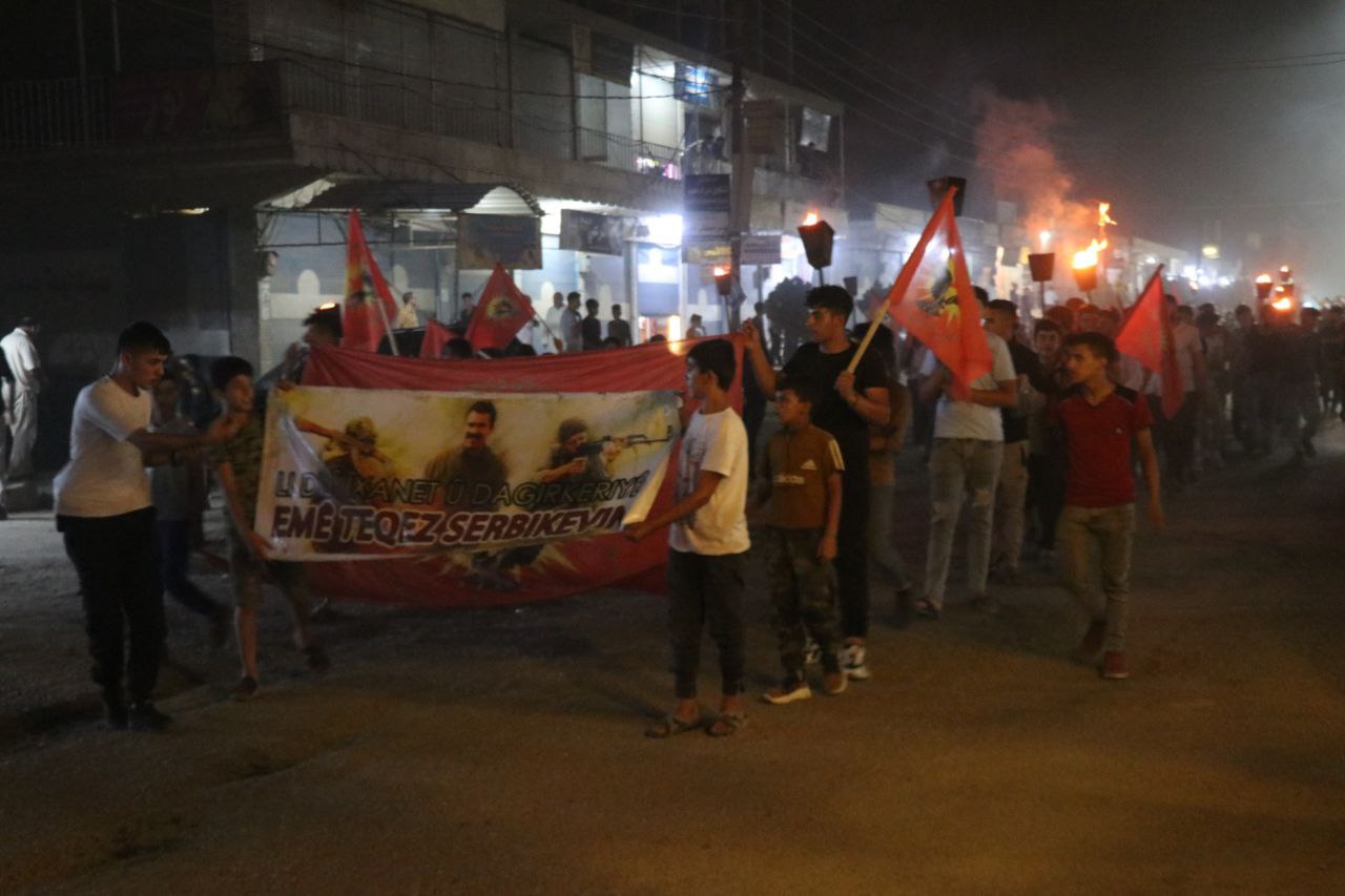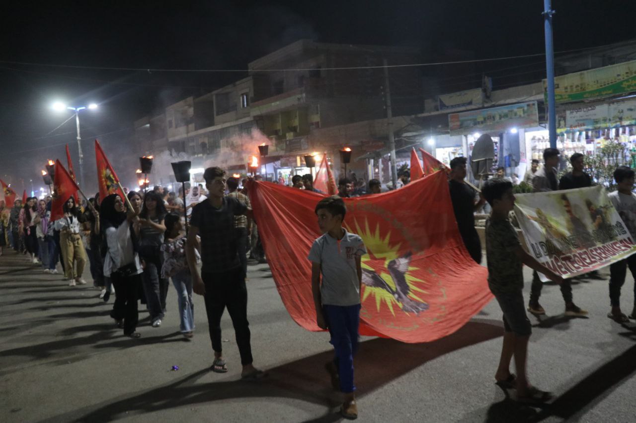 Suriye Devrimci Gençlik Hareketi, Genç Kadınlar Birliği üyeleri ve ilçe halkı Şehit Xebat alanında toplanarak yürüyüşe başladı. Gençler, ilçenin merkez çarşısına kadar yürüdü. Orada, Genç Kadınlar Derneği üyesi Wedha Salih Ömer tarafından basın açıklaması okundu. Açıklamada, “İşgalci Türk devletinin amacı, tecridi ve diğer politikaları yoğunlaştırarak Önder APO’yu toplumdan uzaklaştırmaktır” denildi. KDP işgalci Türk devletini desteklemektedir. Soykırım politikalarına karşı “saldırılara, işgale, PDK ihanetine yeter! Şimdi Özgürlük zamanı! Diyoruz.