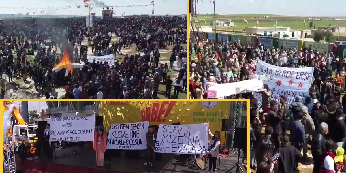 Şehba’nın Newroz kutlama programının başlamasından hemen önce Şehba’lı genç kadın ve erkekler, yaptıkları keşif maketiyle ve gerillayı selamlayan pankartlarla kutlama alanına geldi. Gençler Bijî Berxwedana gerîla sloganlarıyla maket keşifi ateşe verdi.