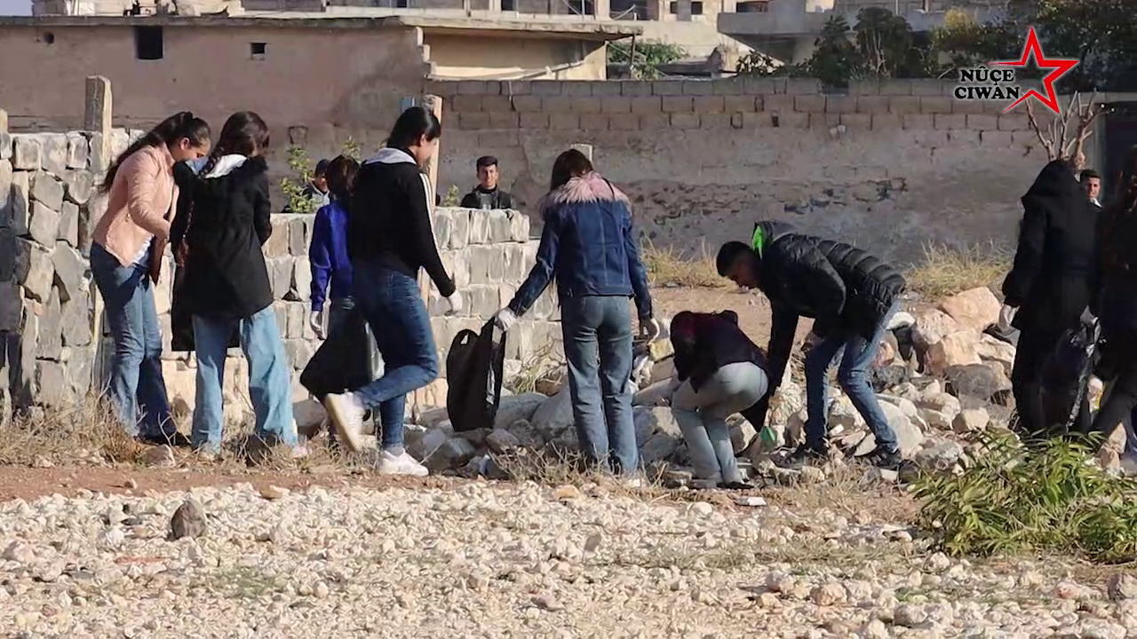 Efrin ve Şehba kantonu Öğrenci Birliği, Halk Belediyesi ortaklığıyla bu sabah 120 erkek ve kız öğrenci ve çok sayıda öğretmenin katılımıyla temizlik Kampanyası başlattı.