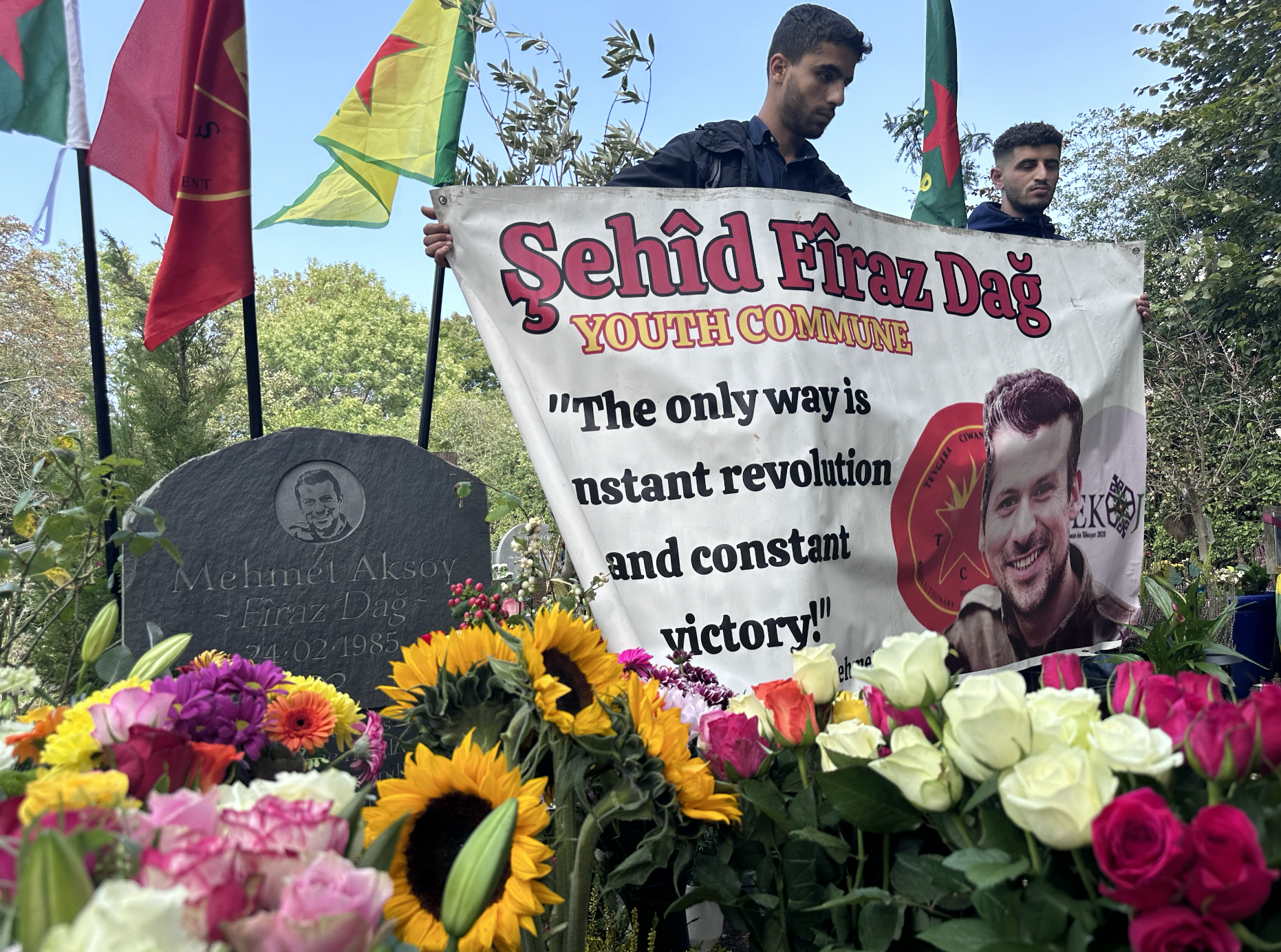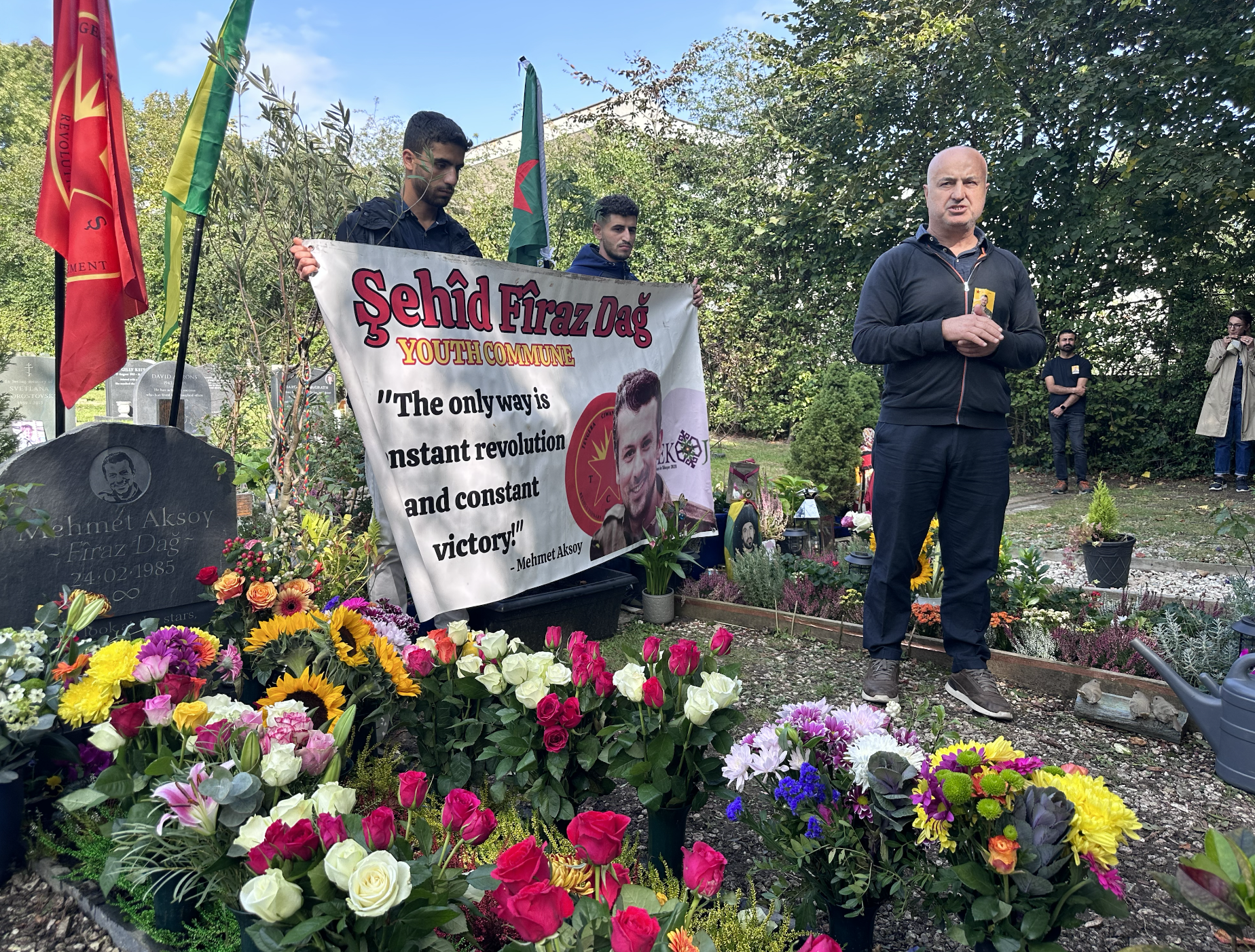 HIGHGATE – “Kapitalizme teslim olmayın, Maddiyata, çirkin ilişkilere, sevgisizliğe, saygısızlığa, yozluğa, eşitsizliğe teslim olmayın” diyen ve YPG basın biriminde iken 26 Eylül 2017 yılında yaşamını yitiren yönetmen, yazar ve gazeteci Mehmed Aksoy (Firaz Dağ), Londra Highgate Mezarlığı’nda ailesi ve sevenleri tarafından anıldı.