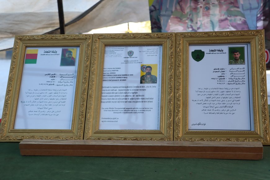 QAMIŞLO- Qamişlo ve Cizre Kantonu’na bağlı köylerden yüzlerce yurttaş, sivil kurum üyeleri, meclis, siyasi parti temsilcileri, askeri ve güvenlik güçleri, şehitler Elî Doko, Faris El Faris ve Dilşad Qamişlo için Qamişlo’daki Şehit Delîl Sarûxan Şehitliği’nde açılan taziye çadırına akın etti.