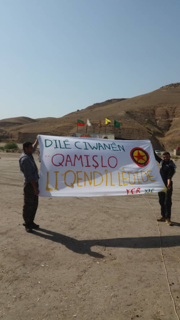 SÊMALKA – Rojava ve Kuzey Suriye Gençlik Örgütlerinin öncülüğünde, Komalên Ciwan’ın başlattığı ‘Serî Hilde’ hamlesinin ikinci aşaması kapsamında işgalci Türk devletinin Güney Kürdistan’a yönelik işgal saldırılarına karşı Sêmalka Sınır Kapısı’nda başlattıkları canlı kalkan nöbet eylemi 6’ıncı gününde sürüyor. 6’ıncı gününde Qamişlo’lu gençler, ‘Qamişlo’nun kalbi Kandil’de atıyor’ slogan ve pankartlarıyla nöbeti devraldı.