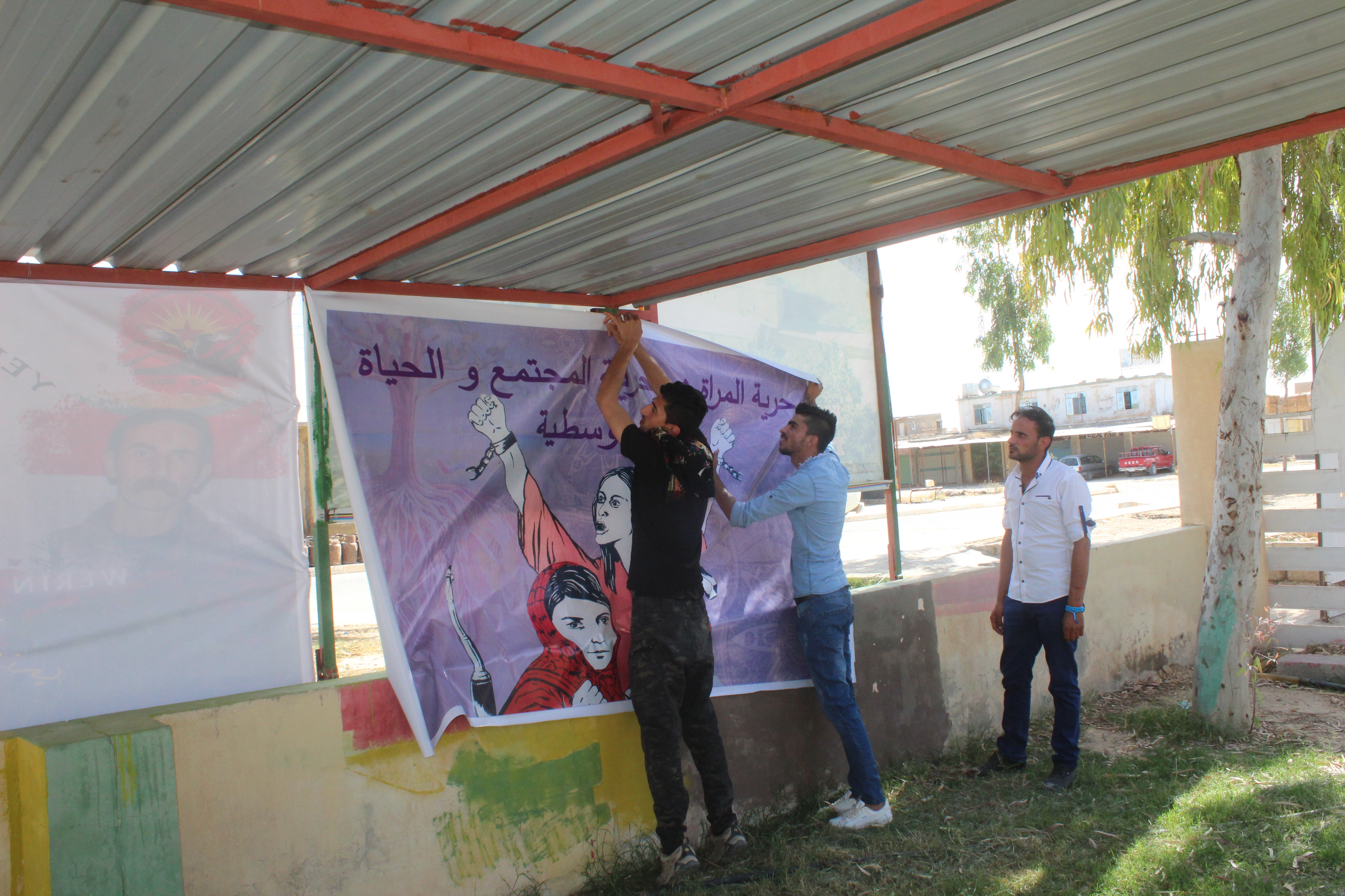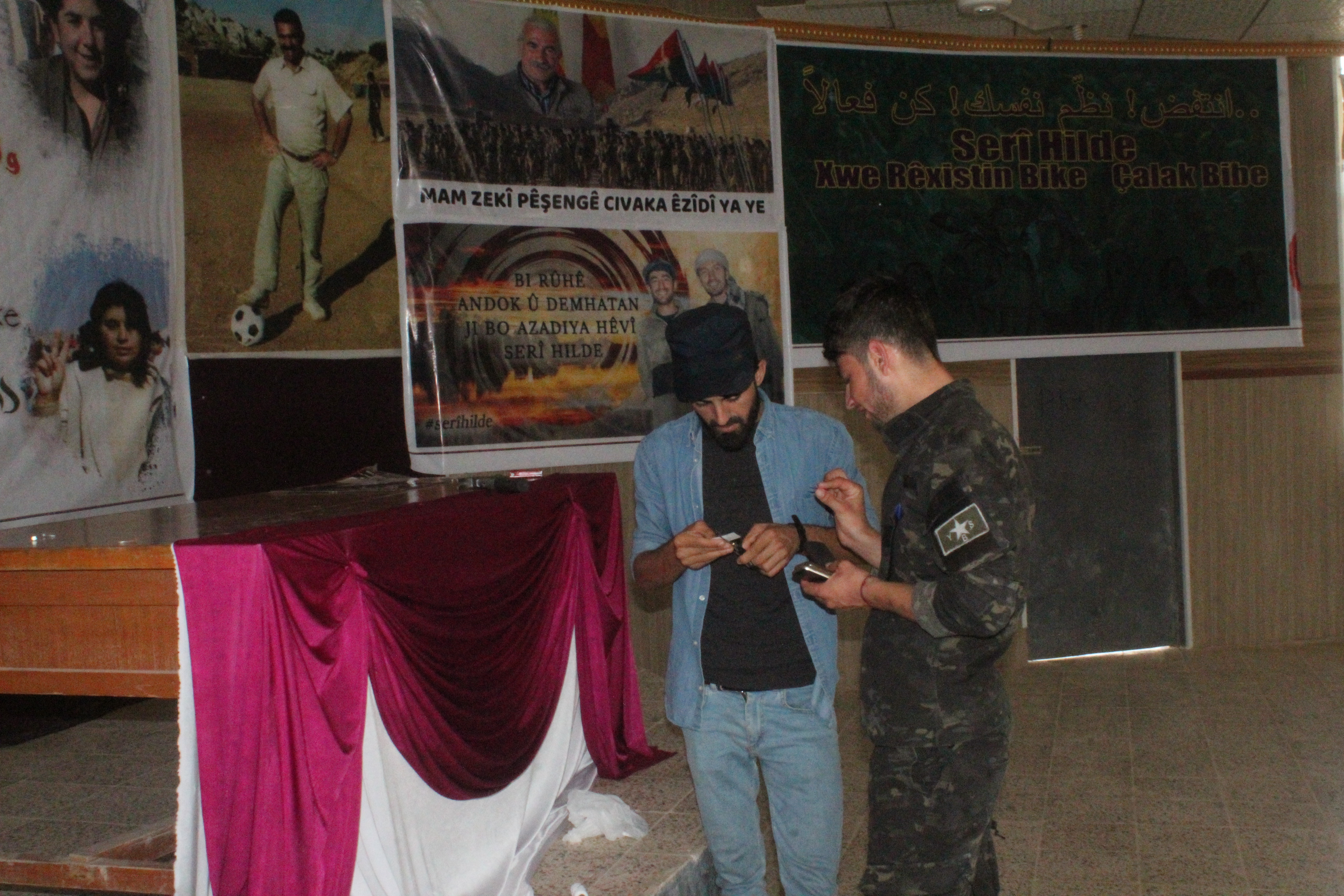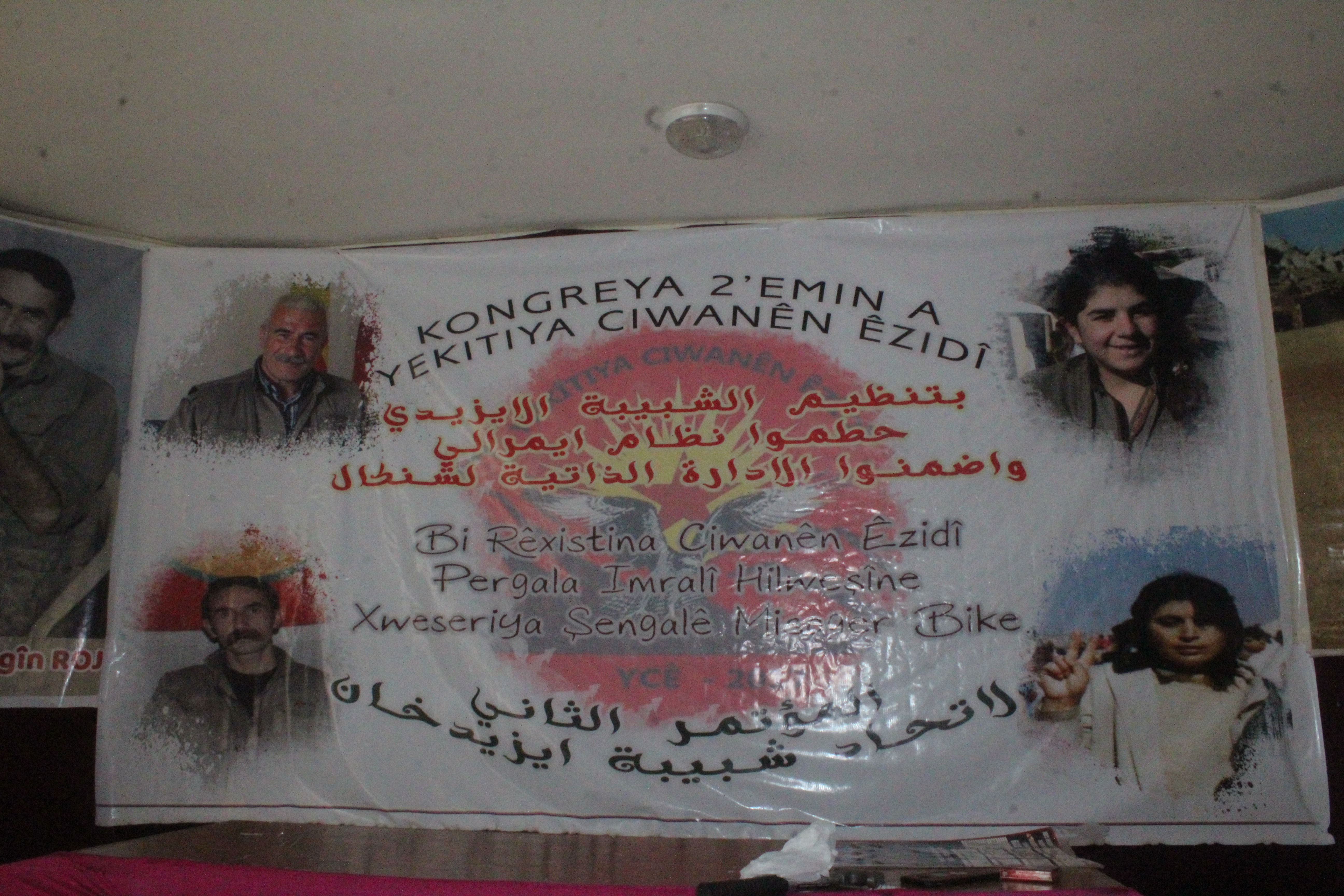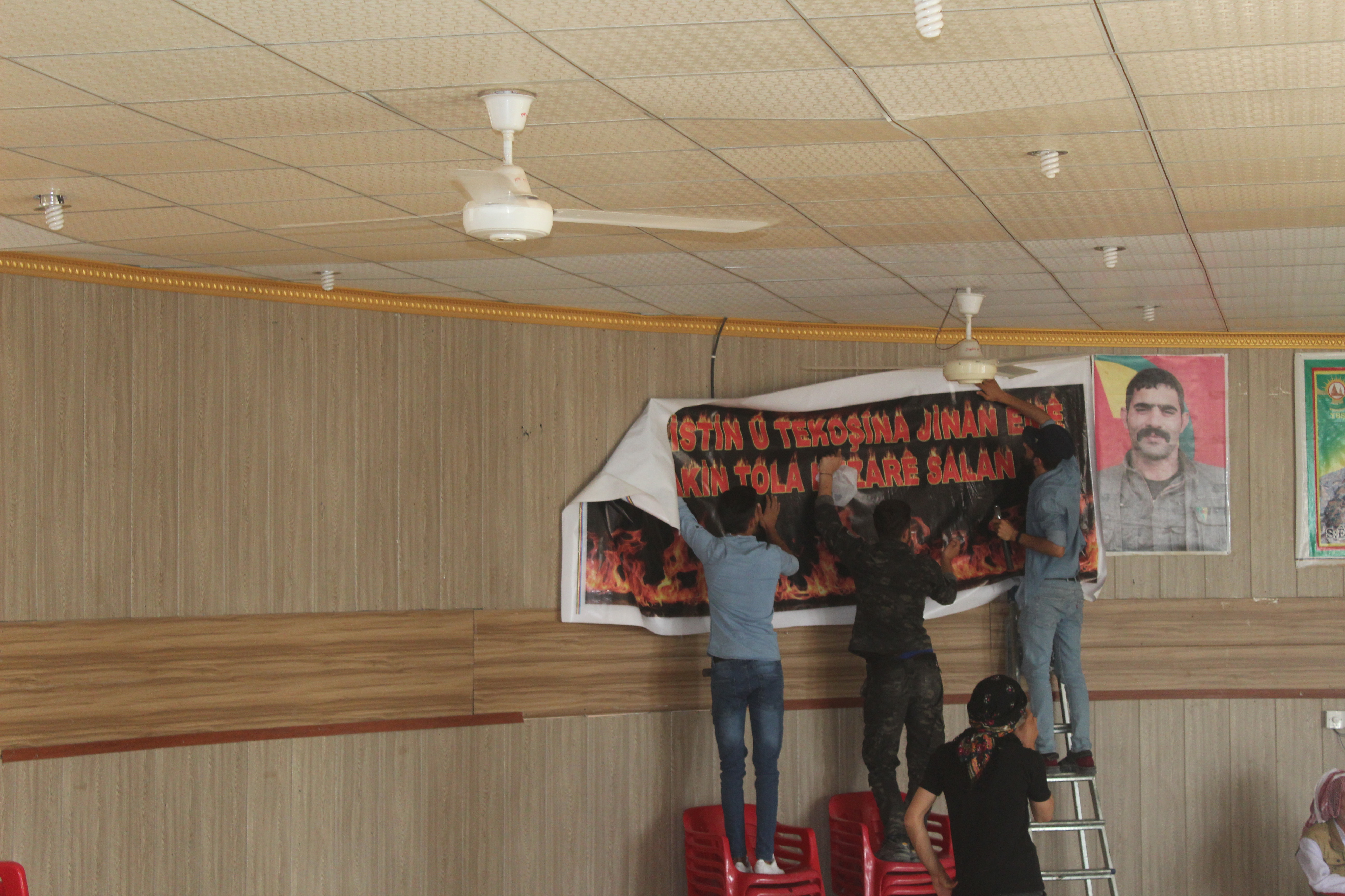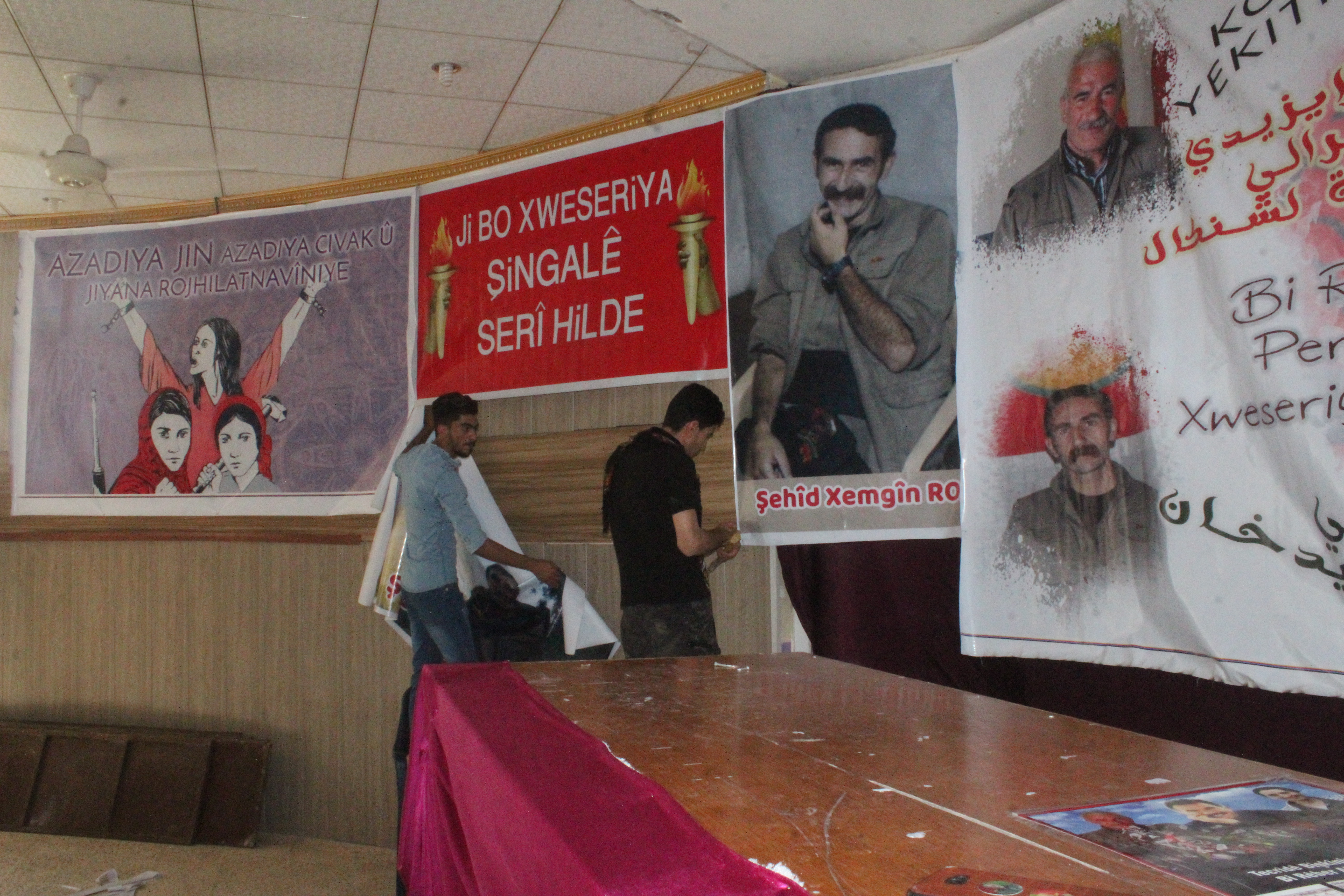 Sabah saatlerinde kongrenin yapılacağı salona gelen Êzîdî gençler salonda pankart ve afişlerini asarak yarın için tüm hazırlıklarını tamamladı.