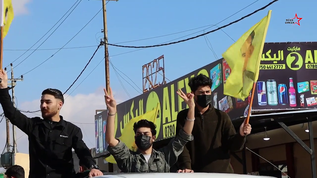 Önder APO bayraklarının taşındığı yürüyüşte, “Bê Serok Jiyan Nabe”, “Selam selam İmralı’ya bin selam”, “Bi Berxwedena Şengalê emê diwarên İmralî hilweşînin” sloganları atıldı. Genç kadınlardan oluşan kültür ve sanat topluluğu Sitiya Nerxşa, davul ve deflerle yürüyüşe renk kattı.