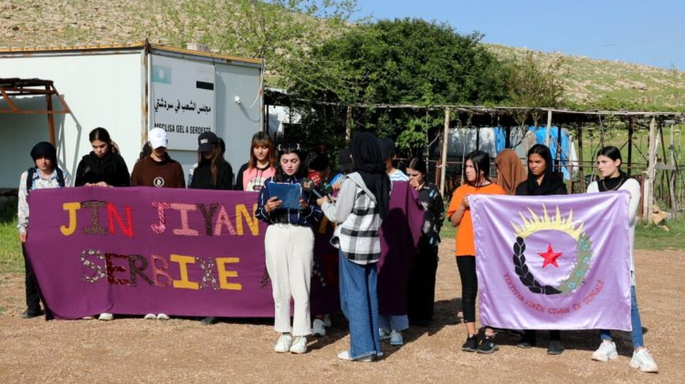 ŞENGAL- Şengal Genç Kadınlar Birliği, Êzidî Özgür Kadın Hareketi (TAJÊ) öncülüğünde başlatılan, ‘Kadın Kırımına Karşı Öz Savunmanın Sesi Ol’ hamlesine ilişkin Serdeşt Halk Meclisi’nde bir basın açıklaması gerçekleştirdi.