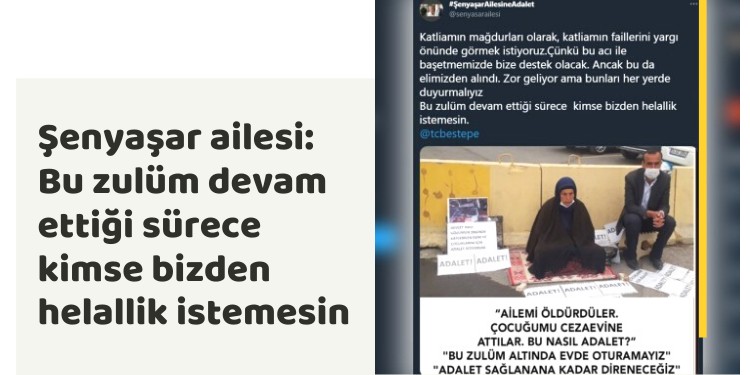 Aile, sanal medya hesaplarından Cumhurbaşkanlığı resmi Twitter hesabını etiketleyerek, “Katliamın mağdurları olarak, katliamın faillerini yargı önünde görmek istiyoruz. Çünkü bu acı ile baş etmemizde bize destek olacak. Ancak bu da elimizden alındı. Zor geliyor ama bunları her yerde duyurmalıyız. Bu zulüm devam ettiği sürece kimse bizden helallik istemesin” mesajı paylaşıldı.