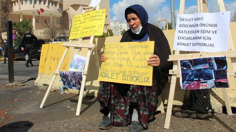 RIHA – Riha’nın Suruç ilçesinde 24 Haziran 2018 genel seçimlerinden önce AKP Urfa Milletvekili İbrahim Halil Yıldız’ın yakınları ve korumalarının saldırısı sonucunda eşini ve iki oğlunu yitiren anne Emine ve oğlu Ferit Şenyaşar’ın, 9 Mart’tan bu yana Riha Adliyesi önünde “adalet” talebiyle başlattığı oturma eylemi 57’nci gününde devam ediyor.