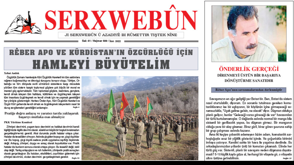 HABER MERKEZİ – Serxwebûn’un 489. sayısında, dünya ve bölgede yaşanan son siyasal gelişmeler, ‘Özgürlük Zamanı’ hamlesi, kadın zindan tarihi, gençliğin dönem görevleri ve Osmanlı’dan günümüze Türkiye’de askeri darbelerin kodlanan zihniyet yapısı ile 17 Eylül 2021 tarihinde Süleymaniye’de Türk devletinin saldırısında katledilen Şükrü Serhed üzerine anı yazısı yer alıyor. Ayrıca Pirdoğan Kemal, “Arı soktu, kayadan düştü öldü yalanı artık tutmuyor” başlıklı yazısında Türk devletinin artık asker cenazelerini alamayacak duruma geldiğini ve üstünü örtmeye çalıştıkları asker ölümlerinin gerillalar tarafından nasıl kayıt altına alınarak deşifre edildiğini yazdı.