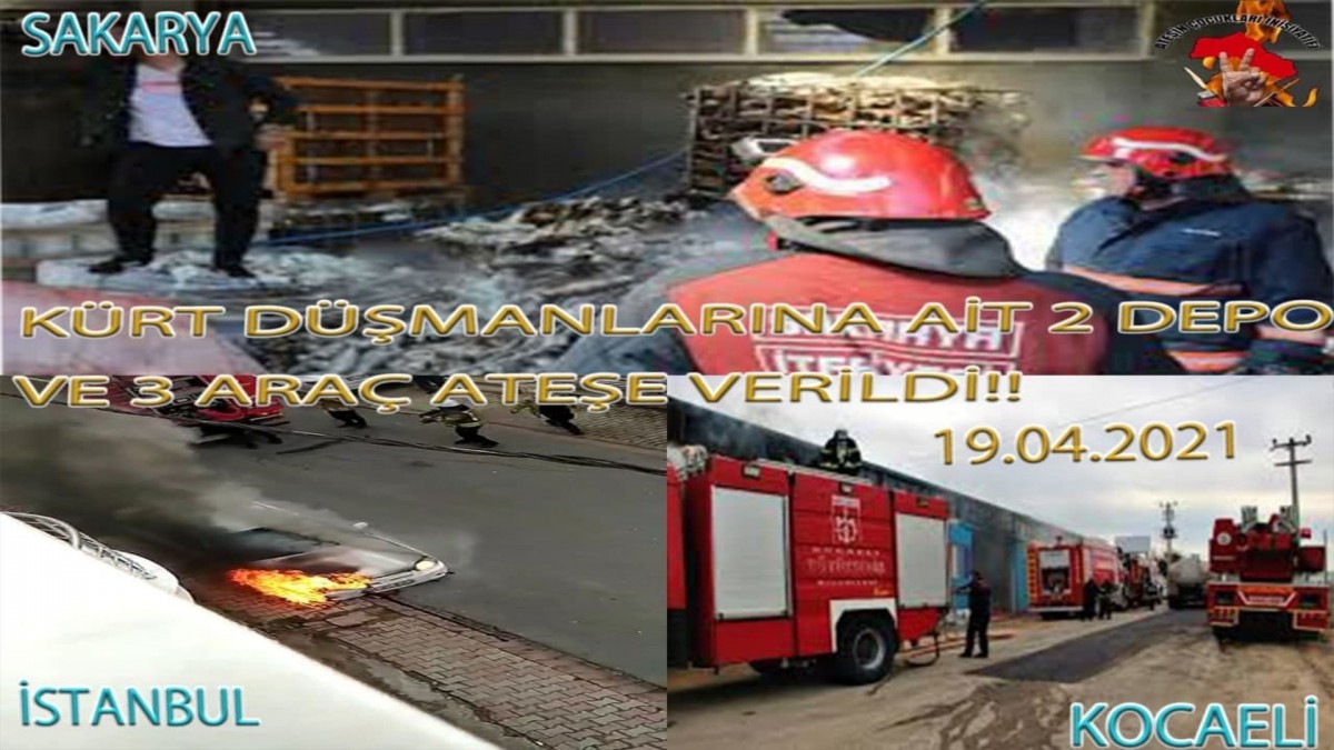 Sakarya, Mersin, Osmaniye, Kocaeli ve İstanbul’da AKP-MHP’lilere ait toplam 2 malzeme deposu ve 3 araç yakılarak küle çevrildi. Kürdistan ve Türkiye’de her fırsatta Kürtlere saldıran ve yaşam hakkı tanımayanlardan her yer ve her anda hesap soracağız. Saray bekçileri ve destekleyicilerinin başta ekonomi kaynakları olmak üzere herşeyi ateşimizde yanmaya mahkum kalacaktır. Gün yurtsever ve ülkesinin özgürlüğüne bağlı olan Kürtlerin intikam günüdür. Ülkemizi yangın yerine çeviren, Lice’de insanları katledip, ağaçları keserek düşmanlığını gösterenlerden intikam almak her onurlu Kürdün boynunun borcudur. Ateşin Çocukları İnisiyatifi Kürt çocuklarının yüreğindeki özgürlük kıvılcımlarından doğarak ateş tufanı olup Kürt düşmanlarının şehir, köy, dağ ve evlerini saracaktır.Güneşi selamlayan Kürtlerin Ateşten İntikam zamanıdır.