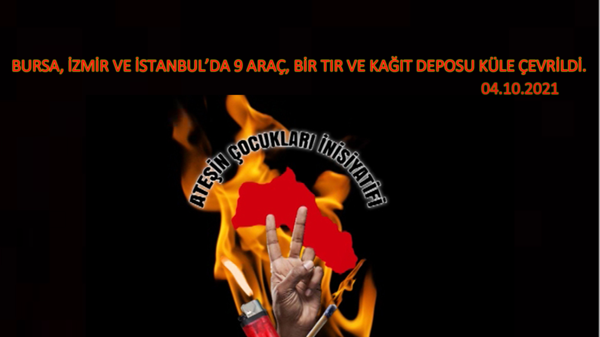Ülkesini işgal edip sömürdüğünüz biz Kürtlerin siz Türk faşistlerinin araçlarıyla rahat rahat gezmesine izin vermeyeceğiz. Eğer hergün biz Kürtlerin kanı akıyorsa bunun hesabının sorulacağını herkes bilmeli. Kürdistan’da terör saçan, panzerleriyle, askeri ve polisiyle ölüm kusan cellatlara karşı Bursa, İzmir ve İstanbul’da 9 araç, 1 tır ve 1 kağıt deposu da yakılıp küle çevrilmiştir.