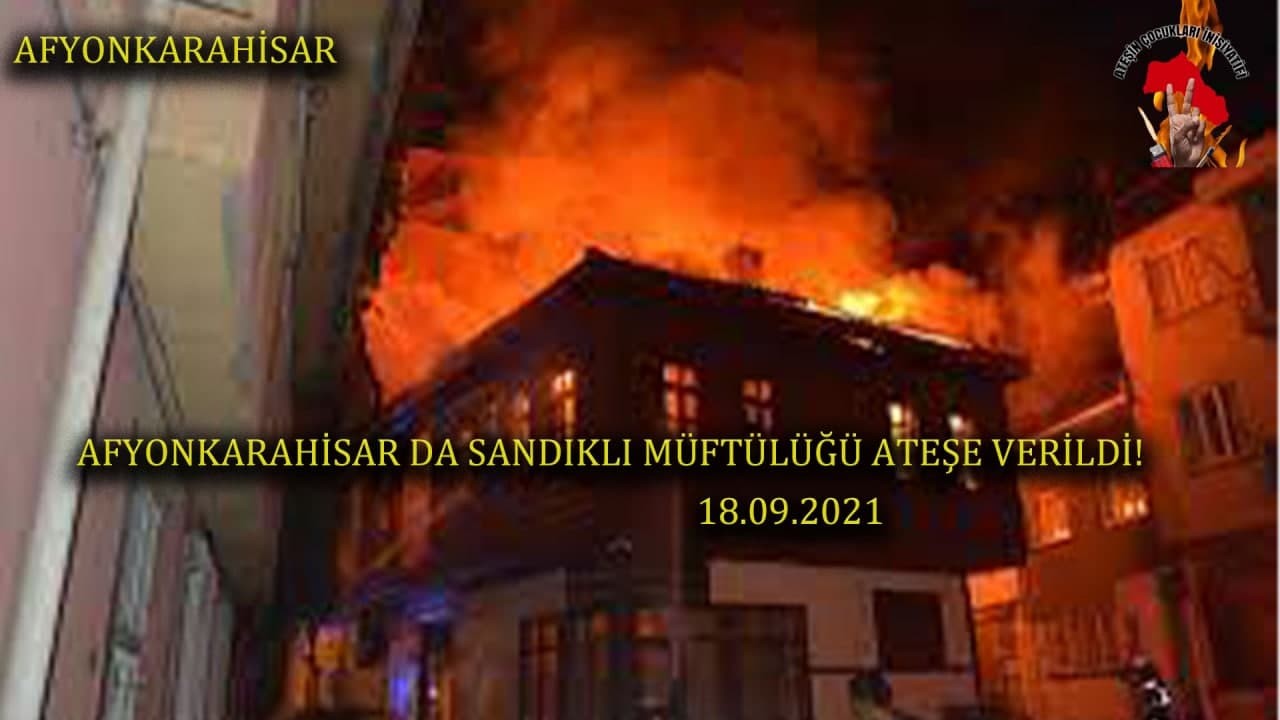 HABER MERKEZİ – Ateşin Çocukları İnisiyatifi Afyonkarahisar’da bulunan Sandıklı Müftülüğü Aile ve Din Hizmetleri Merkezi’ni Çöktürme Hamlesi çerçevesinde ateşe verdiğini duyurdu.