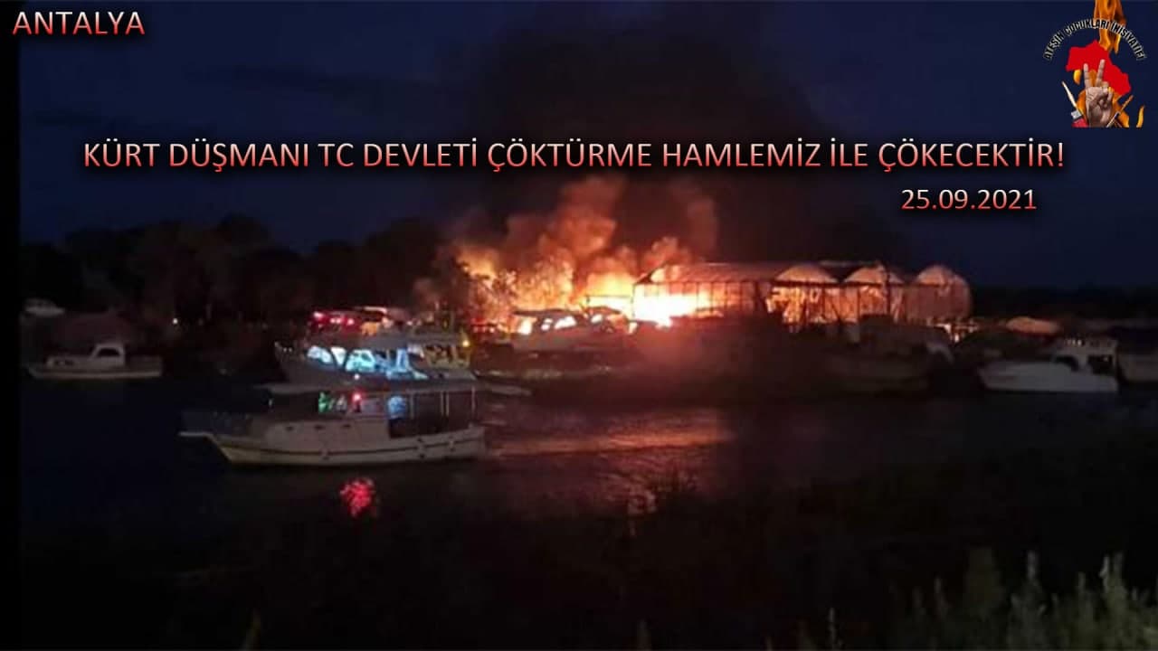 23.09.2021 Antalya’nın Aksu ilçesi Kundu Turizm Merkezi’nde gemi yapımı atölyesi ateşe verilmiştir. 3 tekne küle çevrilirken, 2 tekne zarar görmüştür. 5 Milyon maddi zarar verilmiştir.