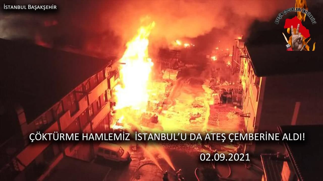 “İstanbul Başakşehir İkitelli Çevre Sanayi Sitesi 11. Blokta bulunan kolonya ve dezenfekten imalatı yapılan kimya fabrikası Çöktürme hamlesine katılan intikama yeminli üyelerimiz tarafından eş zamanlı olarak ateşe verilmiştir. Yan bloklara da sıçrayan ve 35 işletmenin de bulunduğu sokağı kullanılmaz hale getiren intikam ateşinden yana olan üyelerimizi selamlıyoruz. Günlerdir yanan Dersim başta olmak üzere Şırnak, Bitlis ve Bingöl’de yapılan doğa katliamına karşı misliyle hesap soracağımızı belirtmiştik. Ya Kürdistan’dan defolun ya da bundan daha fazlasına hazır olun. Çünkü ülkemizde yaptıklarınız daha fazlasını hak ettiğinizin göstergesidir. Ateşin Çocukları İnisiyatifi olarak her Kürdü hesap soran hamlemize katılmaya çağırıyoruz. Elinizdeki çakmağı, kibriti ve sigarayı kullanarak özgürlük ateşinin birer neferi olun.”