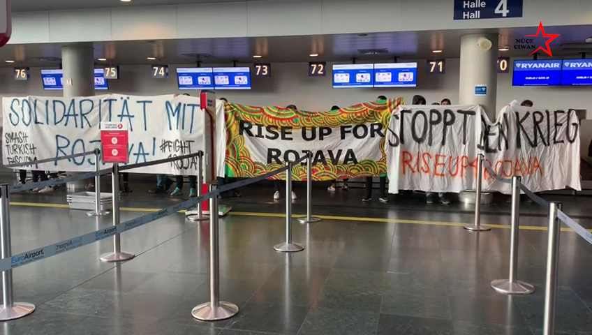 Almanca ‘Rojava ile dayanışma, Rojava için ayağa kalk ve Rojava’ya saldırıları durdur’ yazan pankartlar ile gişe önünde eylem yapan gençler, THY’nin işlem yapmasını bir süre engelledi. Faşist Erdoğan ve ona ekonomik destek veren THY’nin teşhir edildiği eyleme Fransız polisinin kısa süreli bir saldırısı gerçekleşti. Bir gence kimlik kontrolü yapıldı.