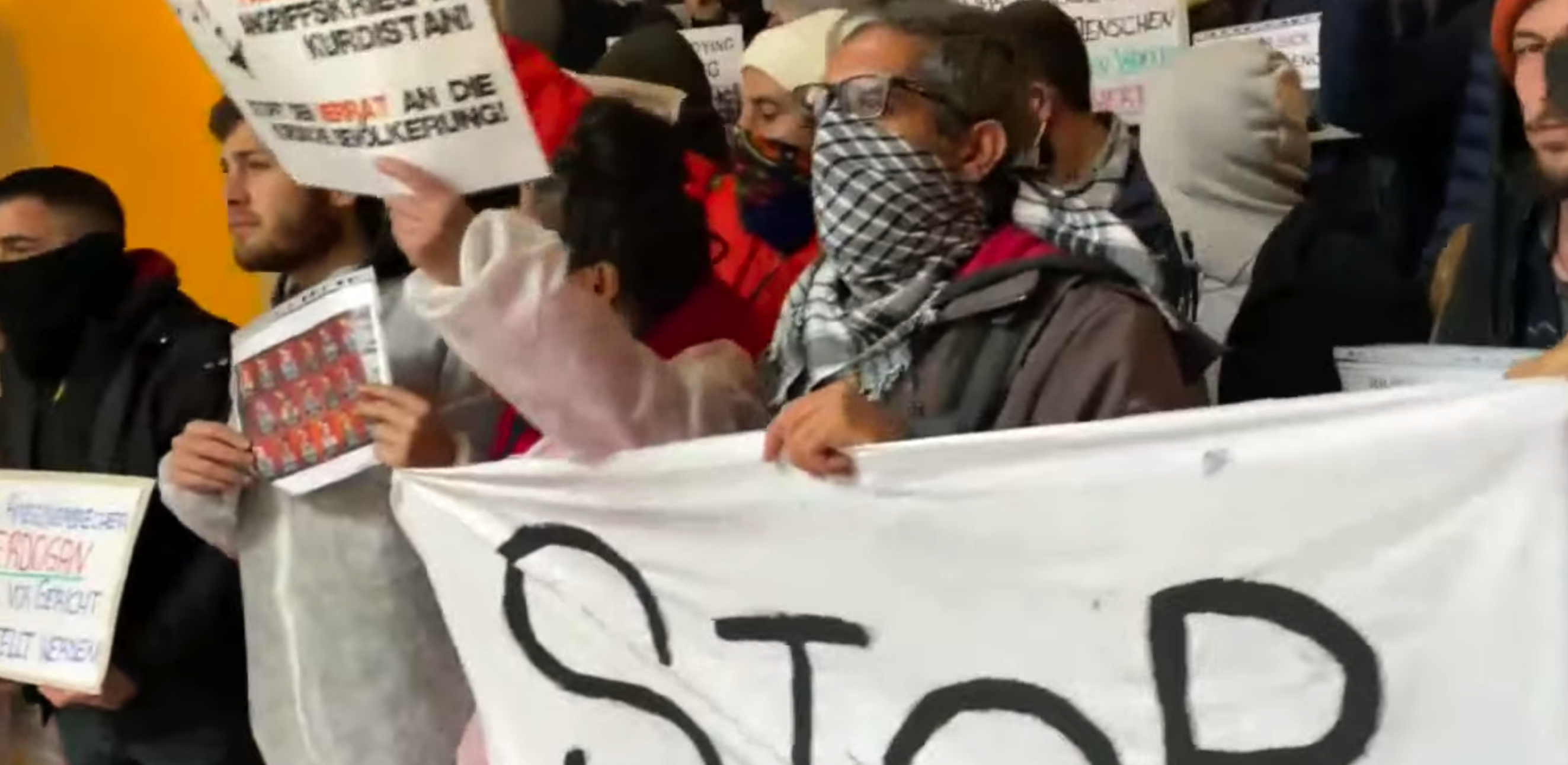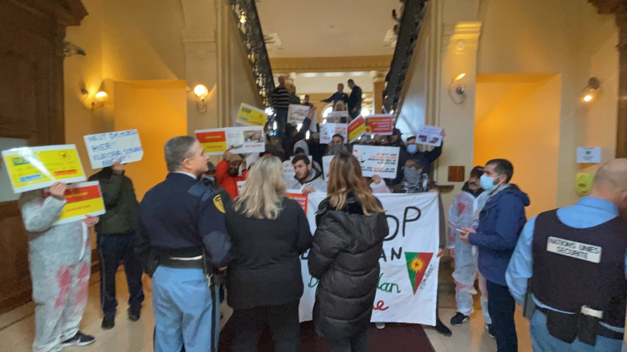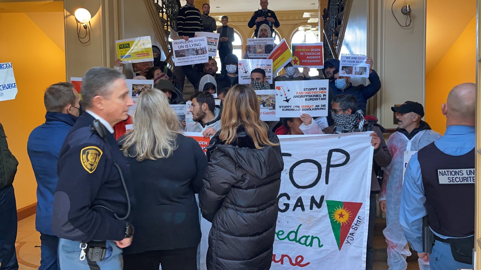 “Faşist TC devleti Kurdistan’ın dört parçasında, taşından toprağına; kadından çocuğa, yaşlısına kadar katliam yapıyor. Bizler Kurdistan yurtsever devrimci gençliği olarak bu katliamların hesabını soracağız. 9 Kasım’da DSÖ (Dünya Sağlık Örgütü) kimyasal silahlarla ilgili bir toplantı sözü vermesine rağmen, ancak şu ana kadar kimse ile temasa geçmediler. Gençliğin bu talebi için doğrudan kurum yetkilileri ile görüşmek istiyoruz. Birleşmiş Milletler’den sorumlu biri sessizliğinin hesabını verene kadar buradan ayrılmayacağız.”