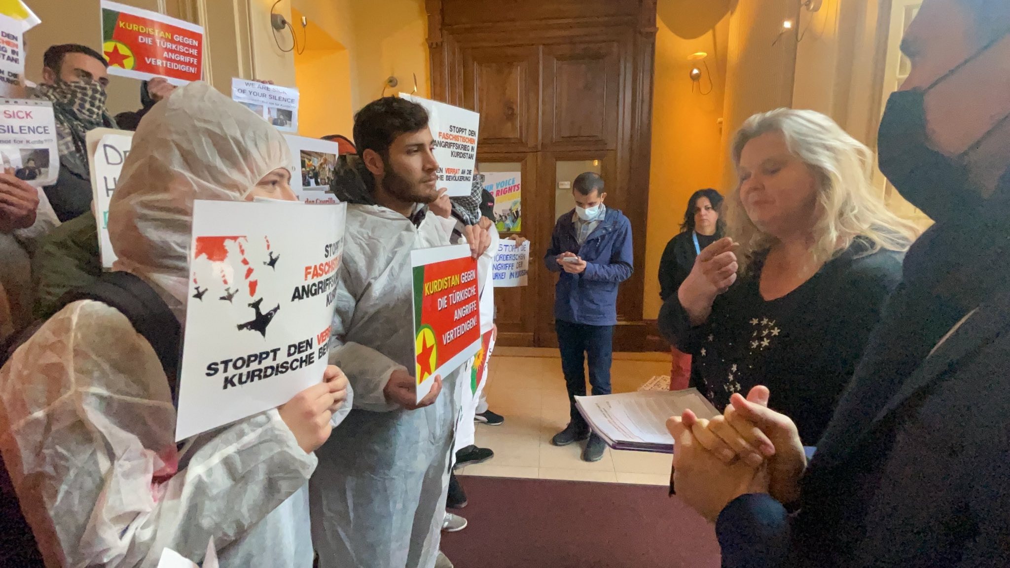 İlerleyen dakikalarda komisyon binasında yer alan yetkililer gençlerin eylem alanına geldiler. Burada yetkililer ile bir konuşma gerçekleştirildi. Gençler burada yetkililere ise şu soruları yöneltti. “Kurdistan’daki savaşı her gün görüyorsunuz ve buna karşı her gün sessizliğinizi koruyorsunuz. Kimyasal silahlar her gün aralıksız bir şekilde kullanılıyor. Bu saldırılara karşı çıkan kişileri ve kurumlara karşı hemen bir baskın veya farklı bir politika uygulanıyor. Şebnem Fincancı’nın açıklamasının ardından hemen tutuklanması da bunların ispatıdır.” Bu konuşmaya hitaben cevap veren yetkililer neler yaşandığını bildiklerini dile getirirken “Neden bir şey yapmıyorsunuz” sorusuna ise hiçbir cevap vermediler.