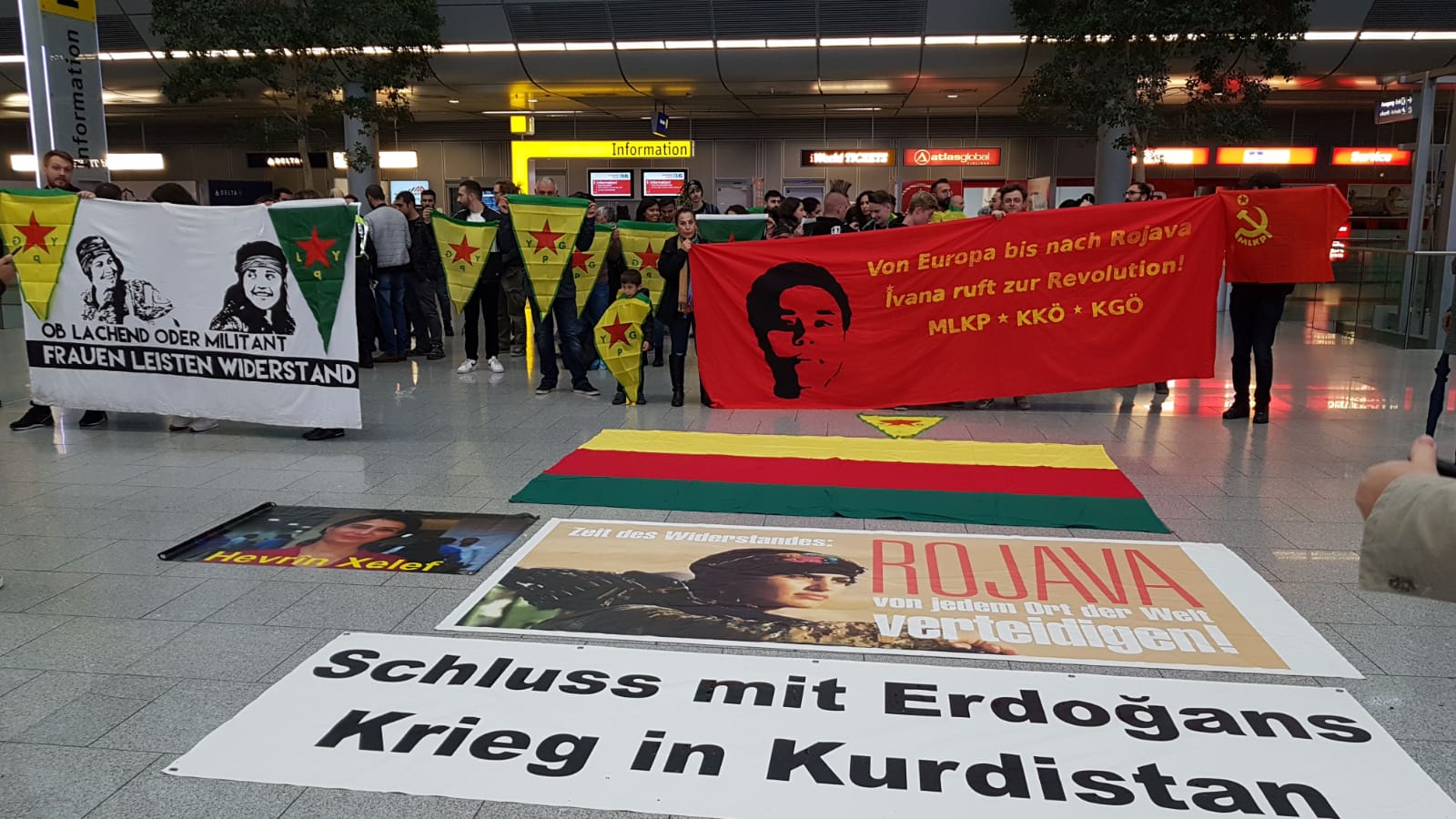 DÜSSELDORF – Kürt ve enternasyonalist gençler, şu sıralarda Düsseldorf Havaalanında bir sivil itaatsizlik eylemi düzenliyor. Gençler sık sık ‘Bijî berxwedana Rojava’ ve Almanca ‘Alman panzerleri Kürdistan’dan dışarı’ sloganları atıyor.