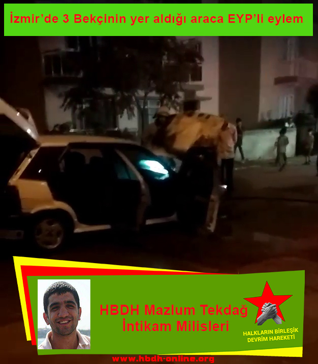 HABER MERKEZİ – Halkların Birleşik Devrim Hareketi (HBDH) Mazlum Tekdağ İntikâm Milisleri tarafından yapılan yazılı açıklamada, “22 Eylül günü 20:45 sularında İzmir’in Menemen ilçesi Asırlık’ta, içerisinde üç bekçinin olduğu seyir halindeki arabaya EYP’li eylem gerçekleştirilmiştir. Patlama sonrası yaralı olarak kaçan bekçilerin terk ettiği araç yanarak kullanılamaz hale gelmiştir” denildi.