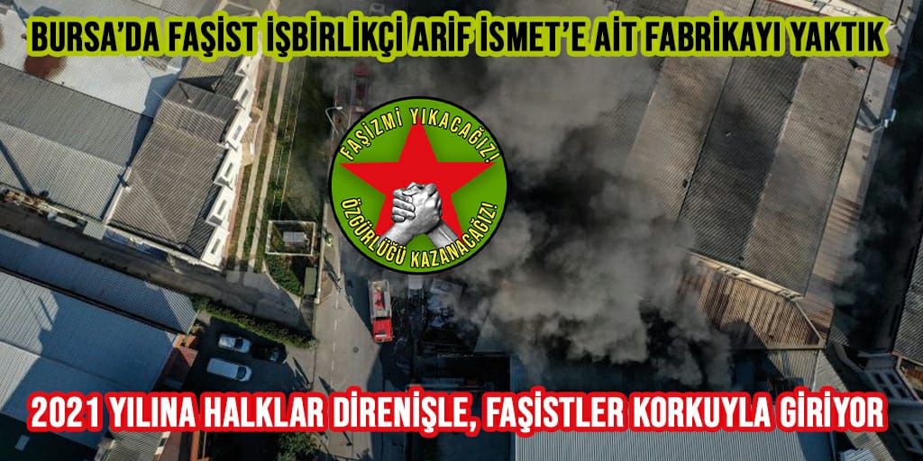 “31 Aralık 2020 günü saat 14:30’ da Bursa Osmangazi’de AKP’li Arif İsmet Terzioğluna ait olan tekstil fabrikası milis güçlerimizin ateşten eyleminin hedefi olmuştur. 500 metrekarelik alanda bulunan fabrika içindeki ürünlerle birlikte tamamen küle dönerken, 1 milyon lira değerinde faşist işbirlikçi zarara uğratılmıştır.”
