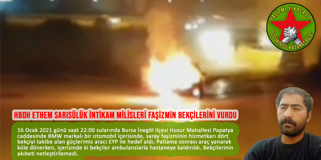 “16 Ocak 2021 günü saat 22:00 sularında Bursa’nın İnegöl ilçesi Huzur Mahallesi Papatya caddesinde BMW markalı bir otomobil içerisinde, saray faşizminin hizmetkarı dört bekçiyi takibe alan güçlerimiz aracı EYP ile hedef aldı. Patlama sonrası araç yanarak küle dönerken, içerisinde ki bekçiler ambulanslarla hastaneye kaldırıldı. Bekçilerinin akıbeti netleştirilemedi.”