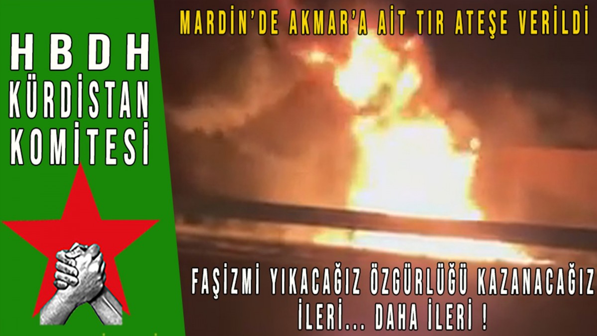 HABER MERKEZİ – Halkların Birleşik Devrim Hareketi(HBDH) Kürdistan Komitesi, “30 Mayıs 2021 günü Mardin/Derik-Kızıltepe karayolunda hareket halindeyken durdurulan 23 TK 653 plakalı TIR yükü ile birlikte ateşe verildi. TIR’ın sahibi olan Akmar şirketi AKP’lilere ait bir firmadır” dedi.