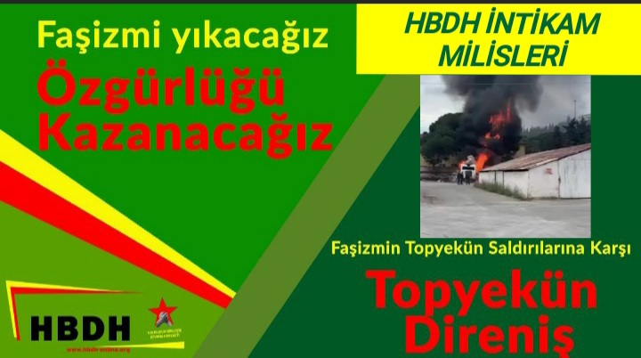 • 30 kasım günü akşam saatlerinde HBDH İntikam Milislerimiz İzmir’in Menemen ilçesinde ‘Faşizmi Yıkacağız Özgürlüğü Sağlayacağız.’ hamlesi kapsamında bir eylem gerçekleştirmiştir. Eylemin hedefi belediye ile ortak Metasu şirketinin iştirake deposu olmuştur. Faşist Serdar Aksoy isimli şahsa ait şirket binlerce işçiyi sömürmekte ve faşist rejim ile ortak hareket etmektedir. Şirkete ait resteronlar, oteller ve iş merkezleri bulunmaktadır. Milislerimizin ateşten gerçekleştirdiği eylem sonucunda birçok iş makinası ve otobüste ciddi maddi hasar oluşmuş ve küle dönmüştür. Havuz medyası her zaman olduğu gibi gerçekleri yansıtmamış ve sıradan bir olay gibi yansıtmıştır. Serdar Aksoy isimli şahıs ve yönettiği şirket halkımızı sömürdüğü ve ezdiği için hedefimiz olmuştur.