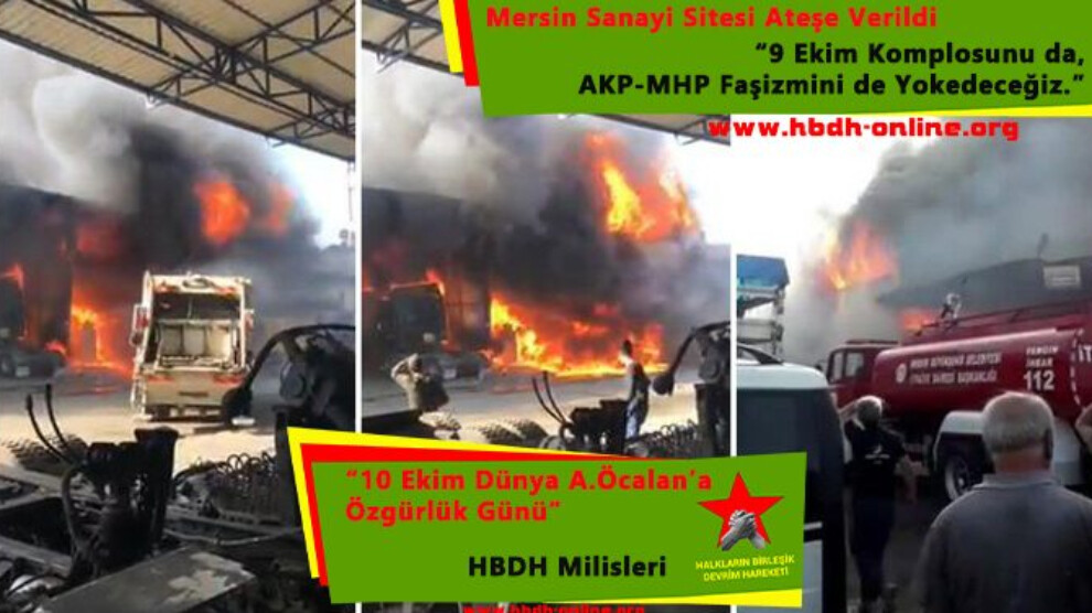 HABER MERKEZİ – 09 Ekim 2020 günü sabah saatlerinde Mersin Tırmıl Sanayi Sitesine “HBDH Milislerince” ateşten eylem gerçekleştirildi. Eylem sonucu çıkan yangında 4 dükkan, 1 Tır, 3 araç ve faşizmin polislerine ait 2 çekici kamyon yanarak imha oldu.