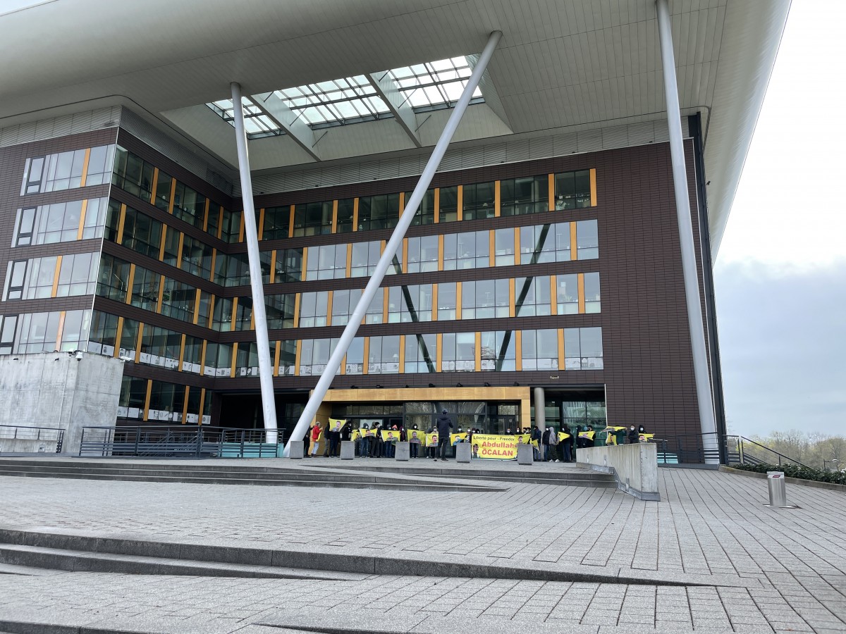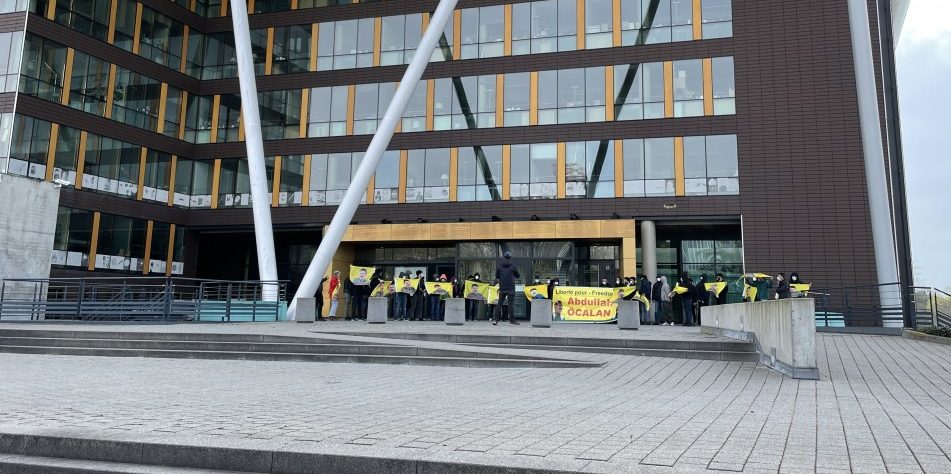 Önder Öcalan’ın posterleri ve PKK bayrakları ile duvarları aşan gençler, bina önünde ‘Liberte Pour Öcalan’ ve ‘Bijî Serok APO’ sloganlarıyla eylemlerini sürdürüyorlar.
