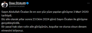 “Sayın Abdullah Öcalan ile en son yüz yüze yapılan görüşme 3 Mart 2020 tarihiydi. Biz aile olarak yıllar sonra 23 Ekim 2024 günü Sayın Öcalan ile görüşme gerçekleştirdik. Bir yasal hak olan rutin aile görüşünün, koşullar ne olursa olsun devam etmesini istiyoruz.”
